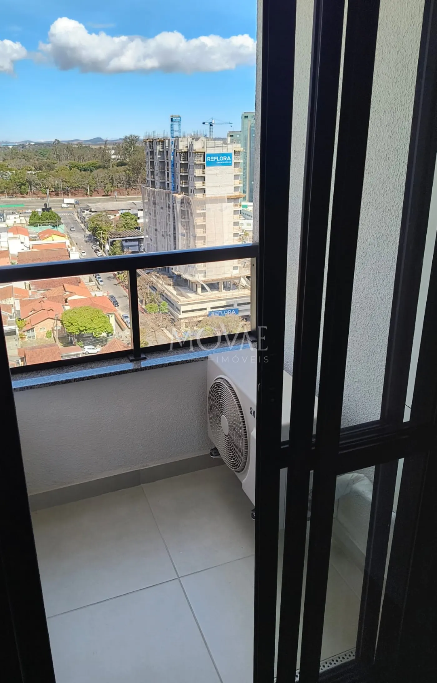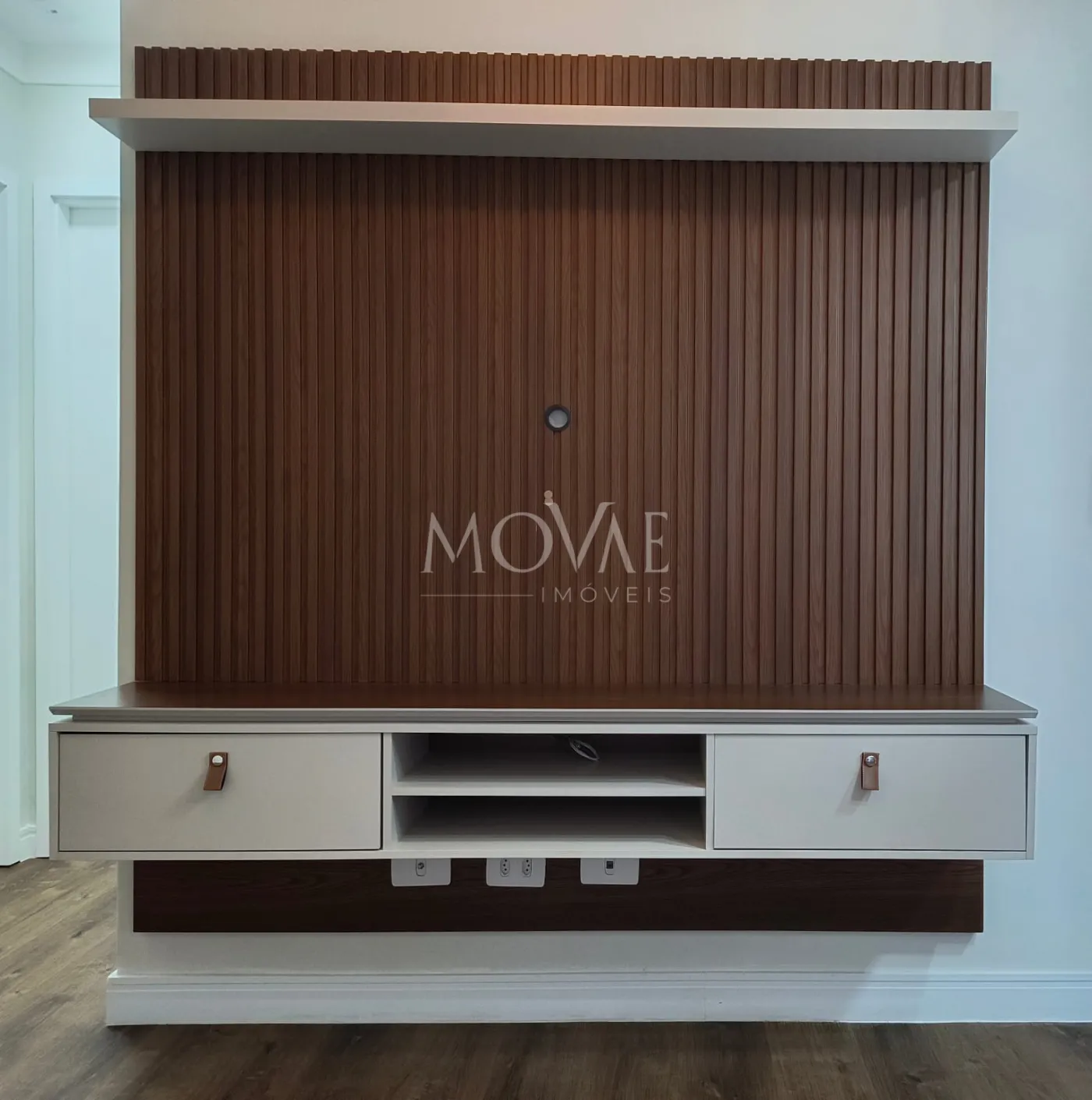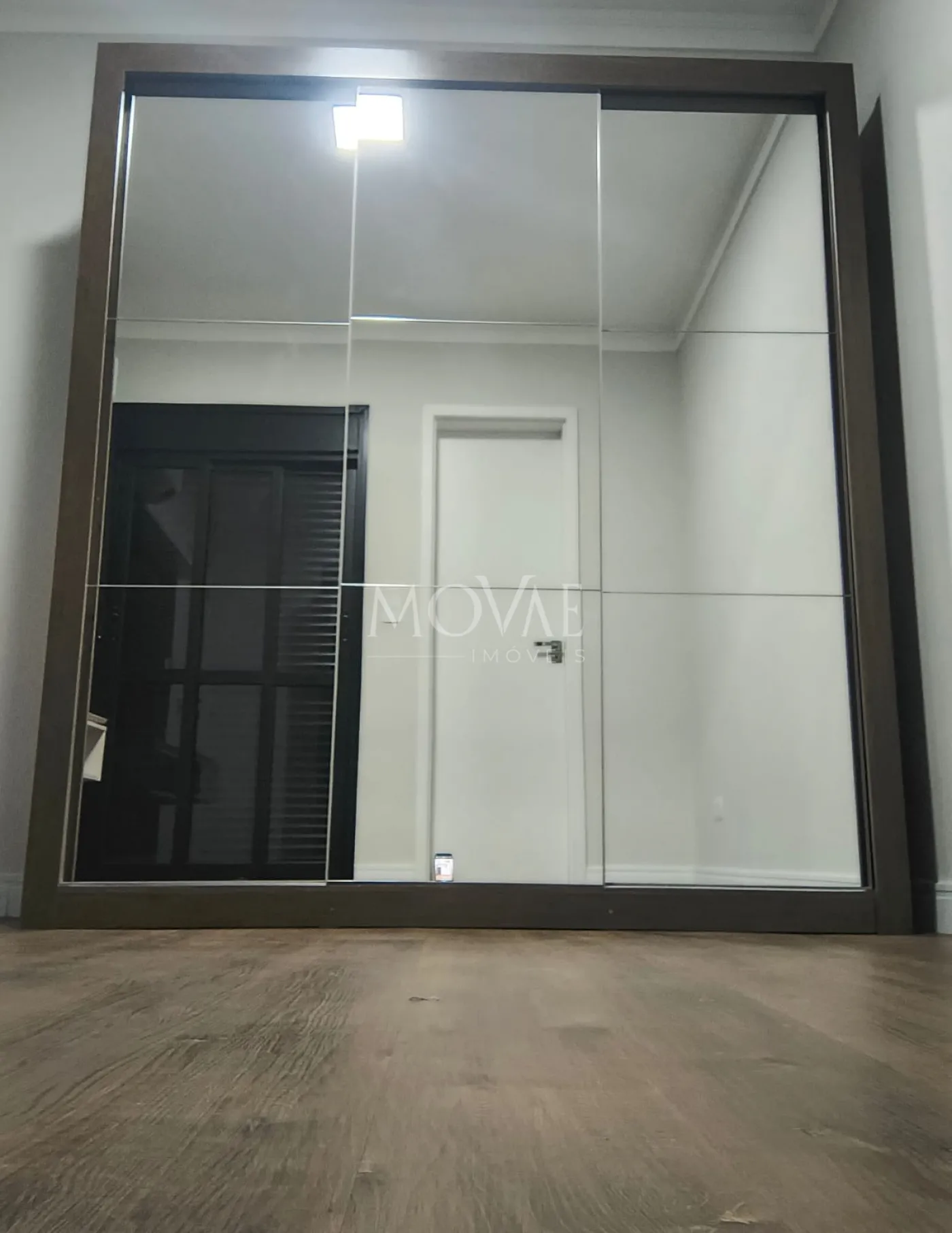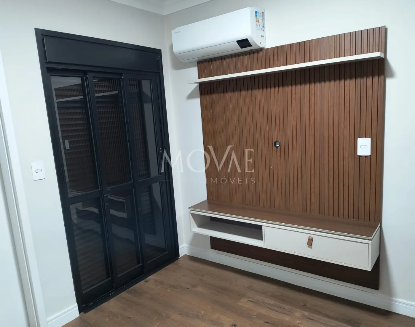 1 suíte casal com guarda-roupa espelhado, painel ripado, ar-condicionado Samsung e varanda;