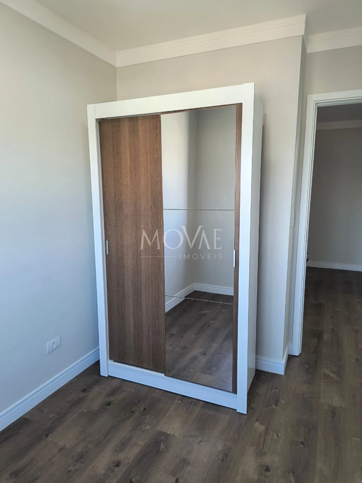 1 dormitório solteiro com guarda-roupa espelhado.
