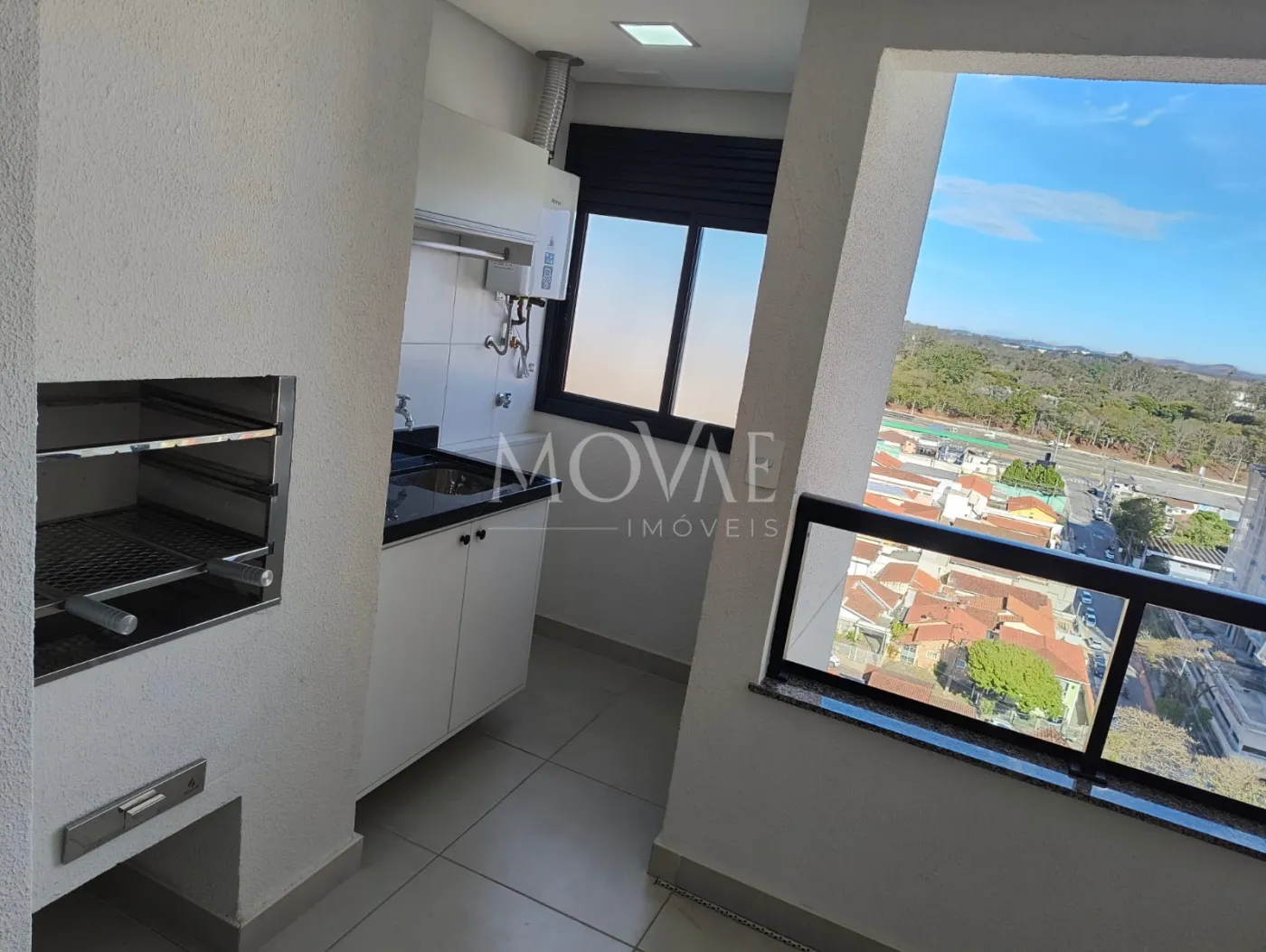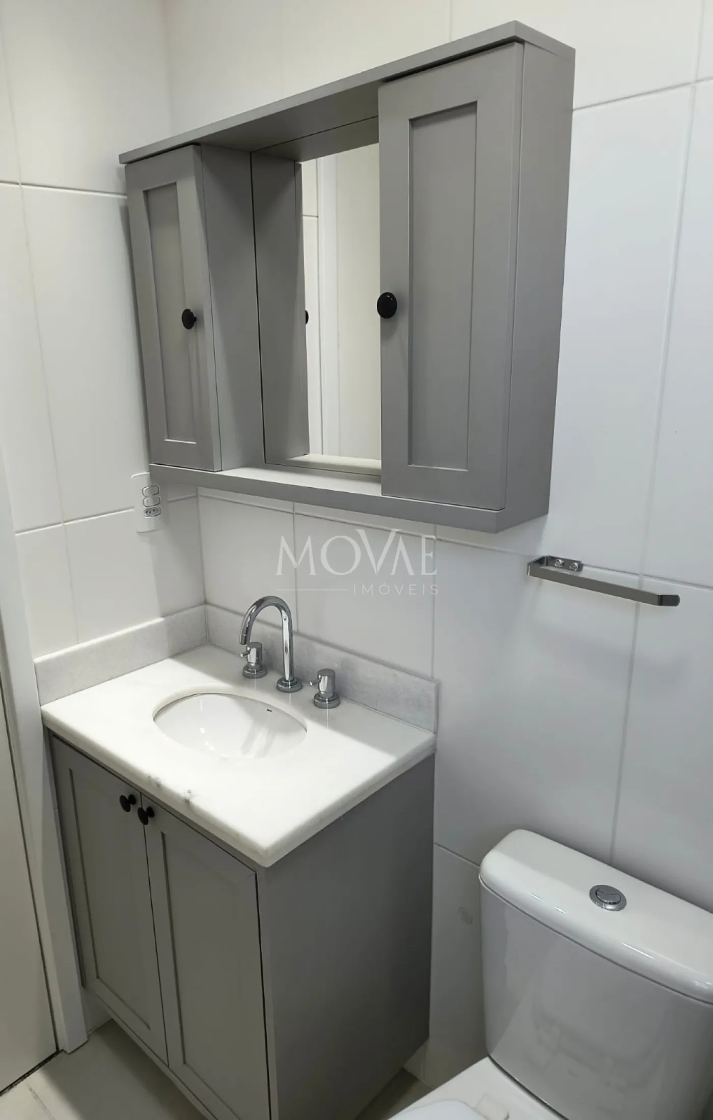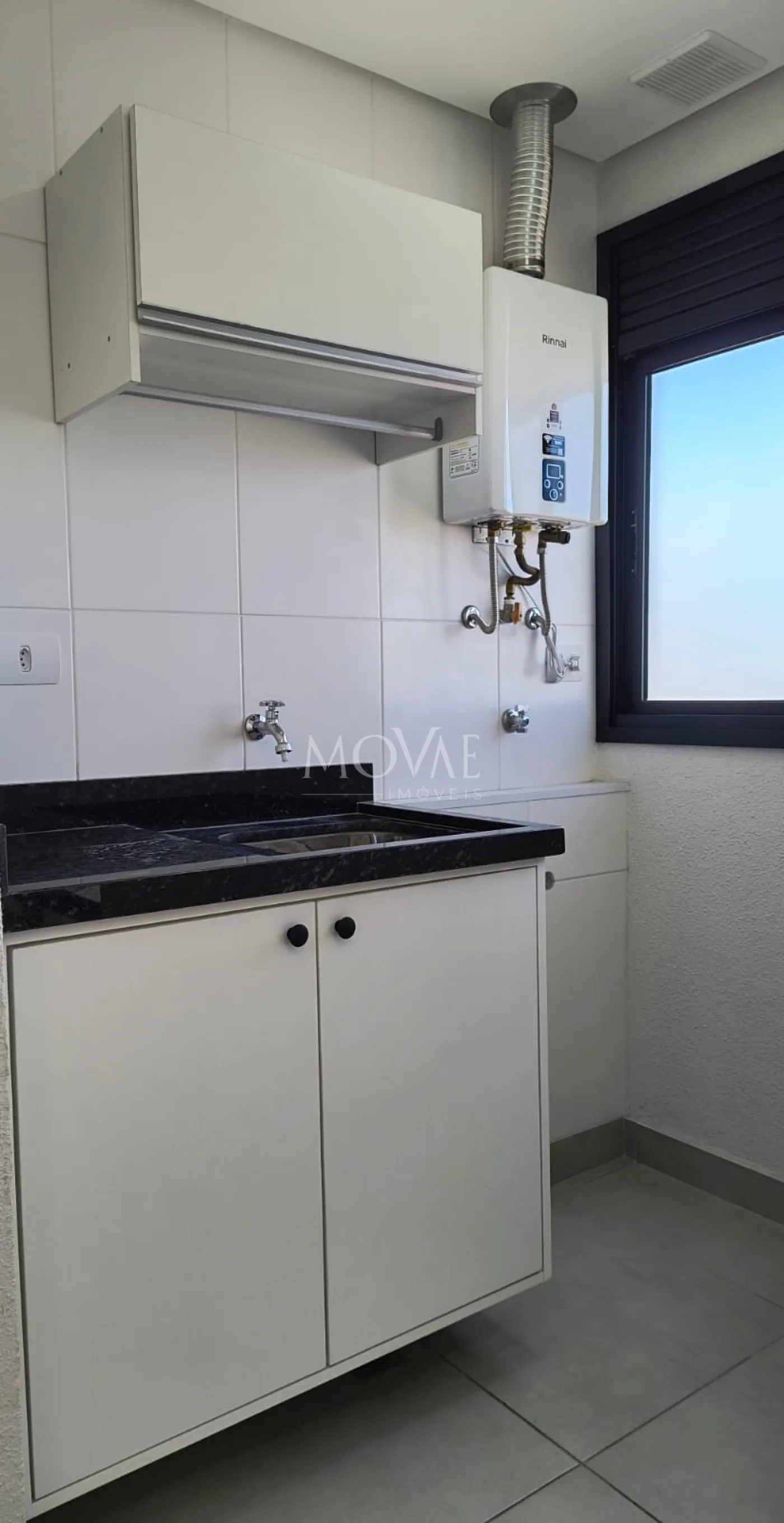 Área de serviços com armário suspenso e gabinete;