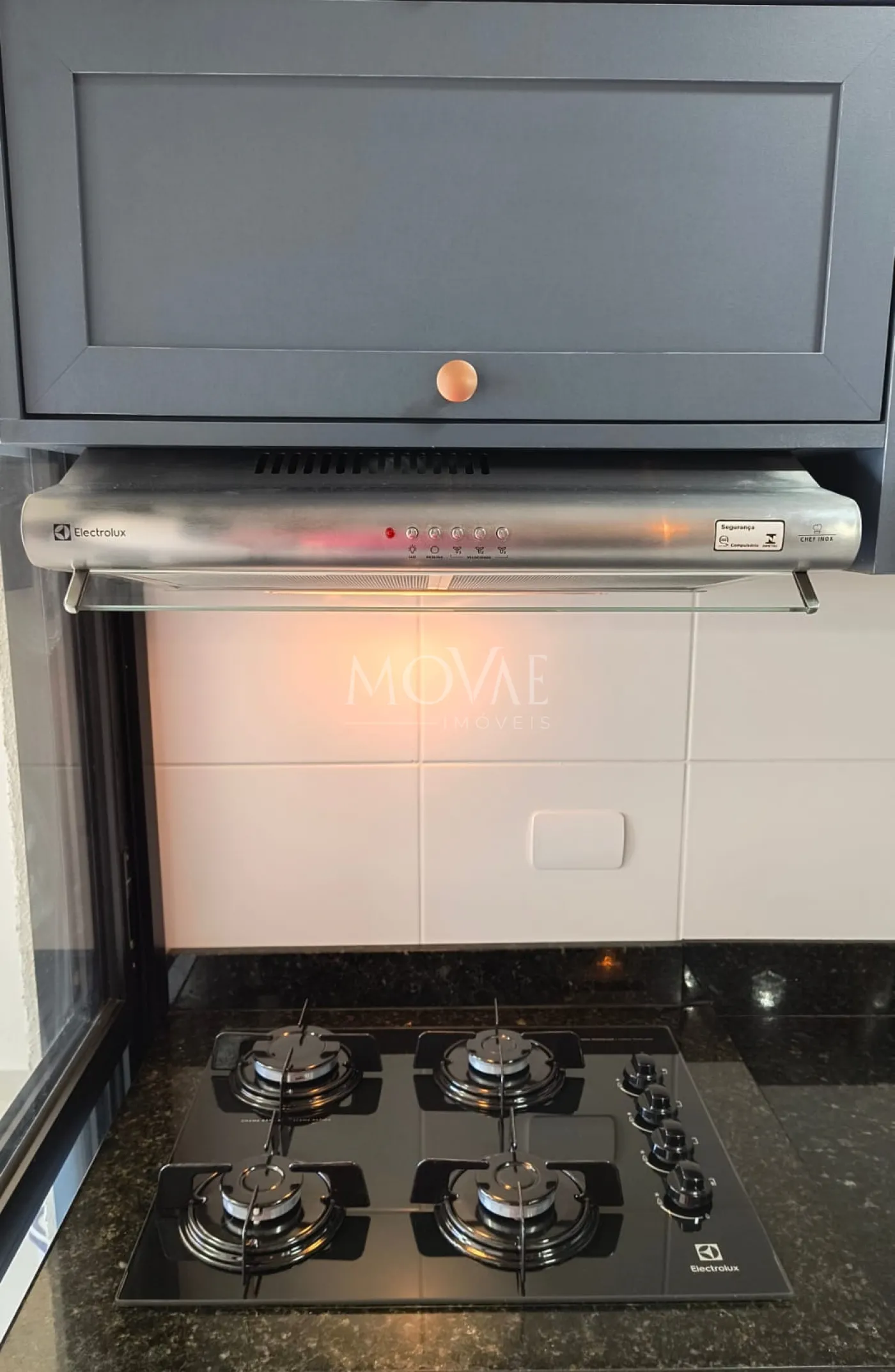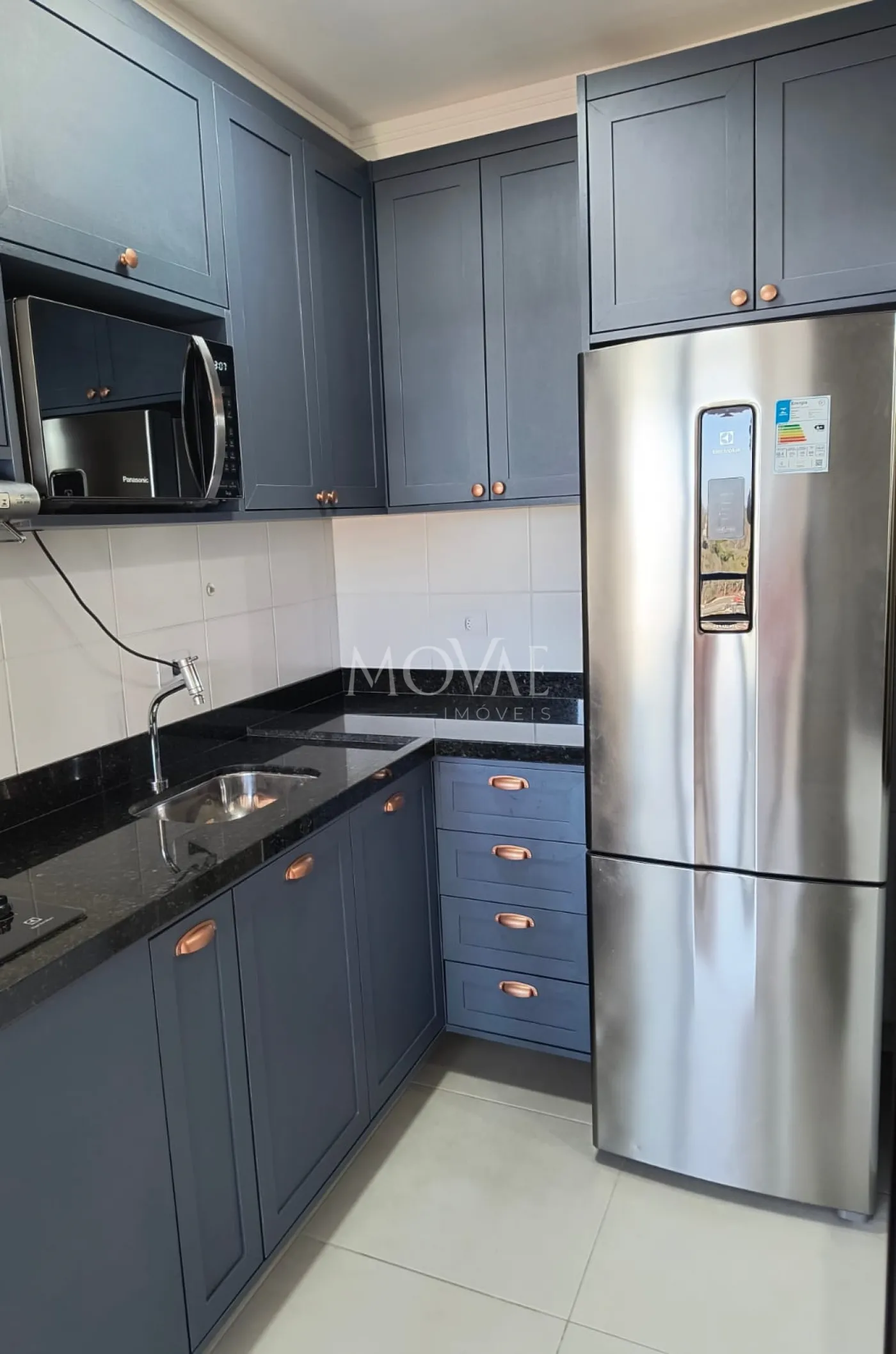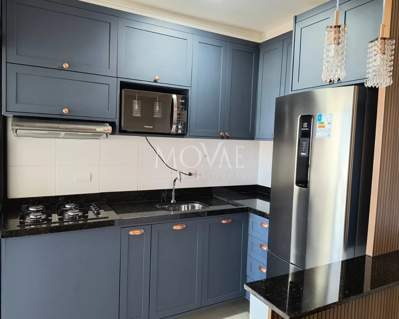 Cozinha planejada completa com armários provençais, equipada com geladeira, cooktop, depurador de ar, cafeteira, torradeira, sanduicheira (Eletrolux) e micro-ondas (Panasonic);
