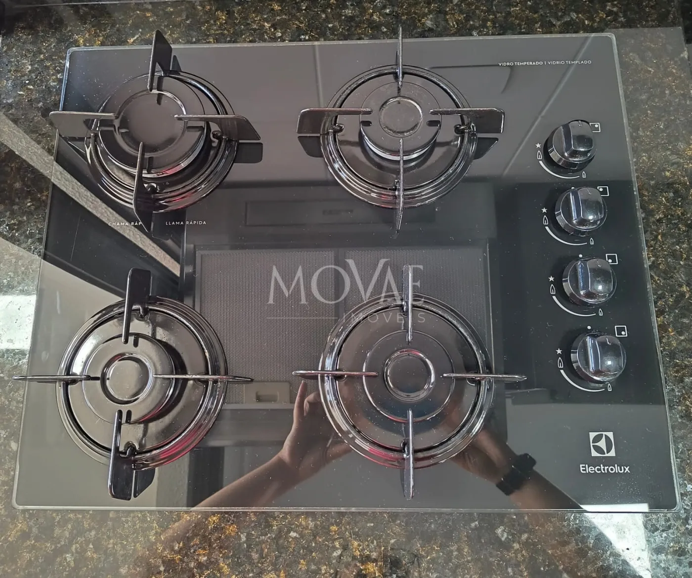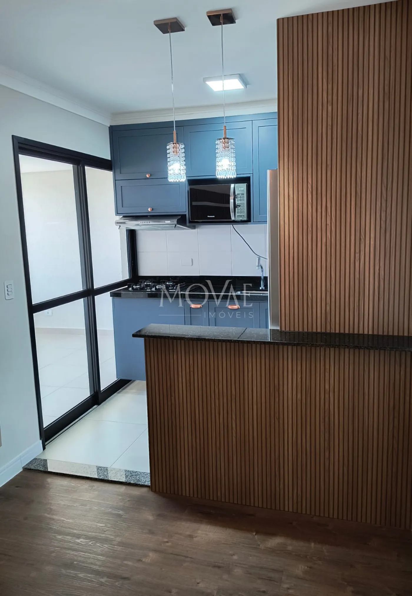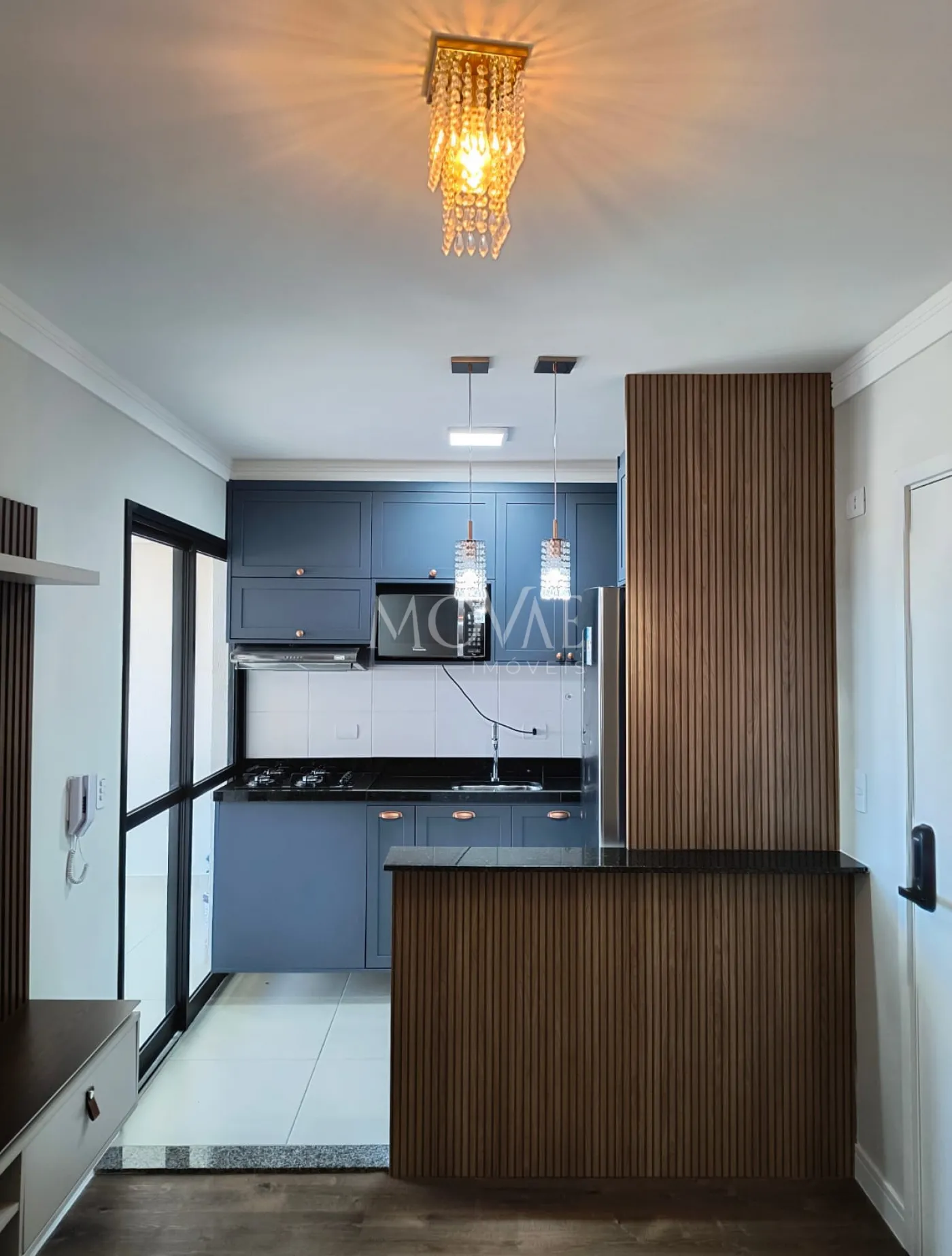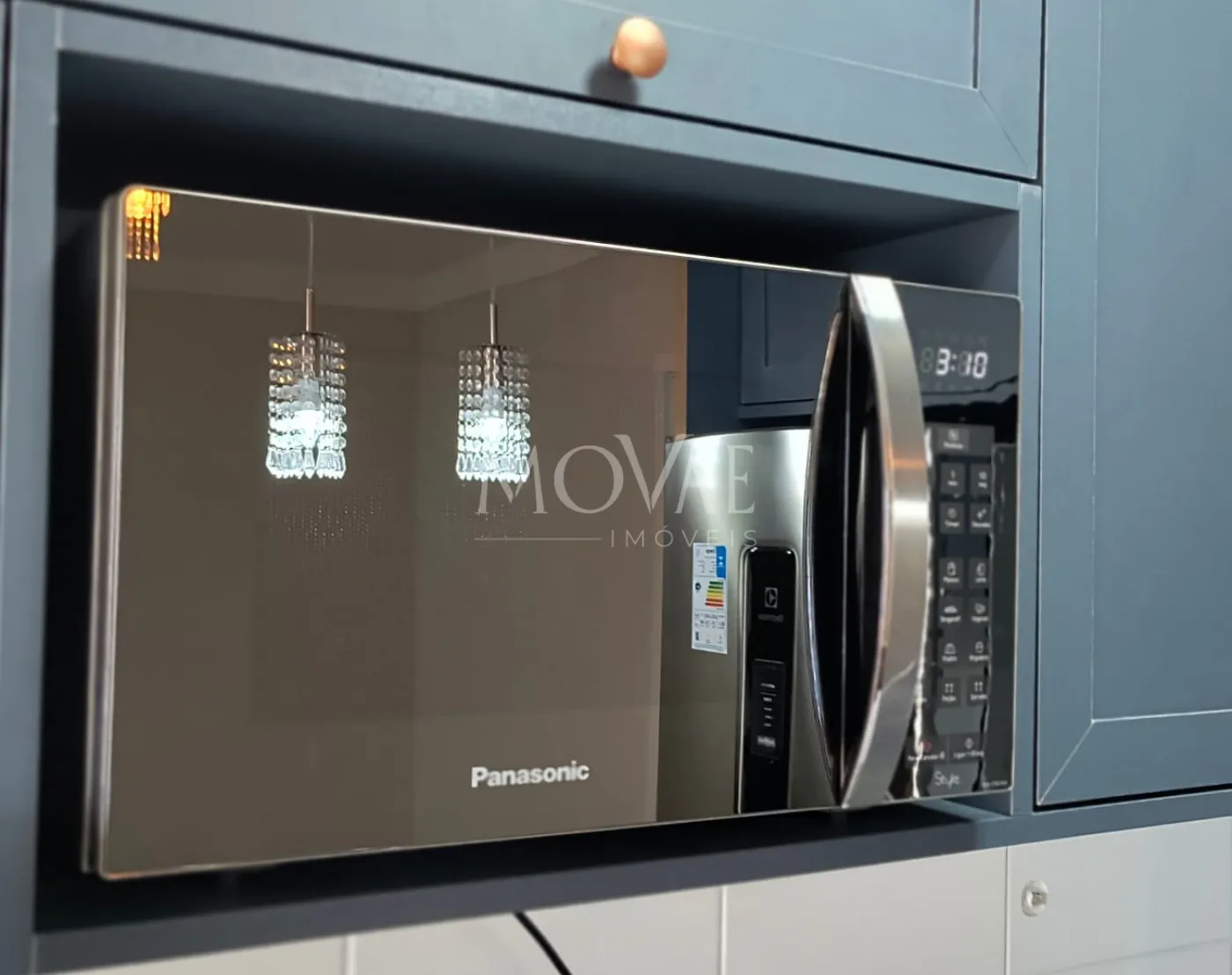 Cozinha planejada completa com armários provençais, equipada com geladeira, cooktop, depurador de ar, cafeteira, torradeira, sanduicheira (Eletrolux) e micro-ondas (Panasonic);