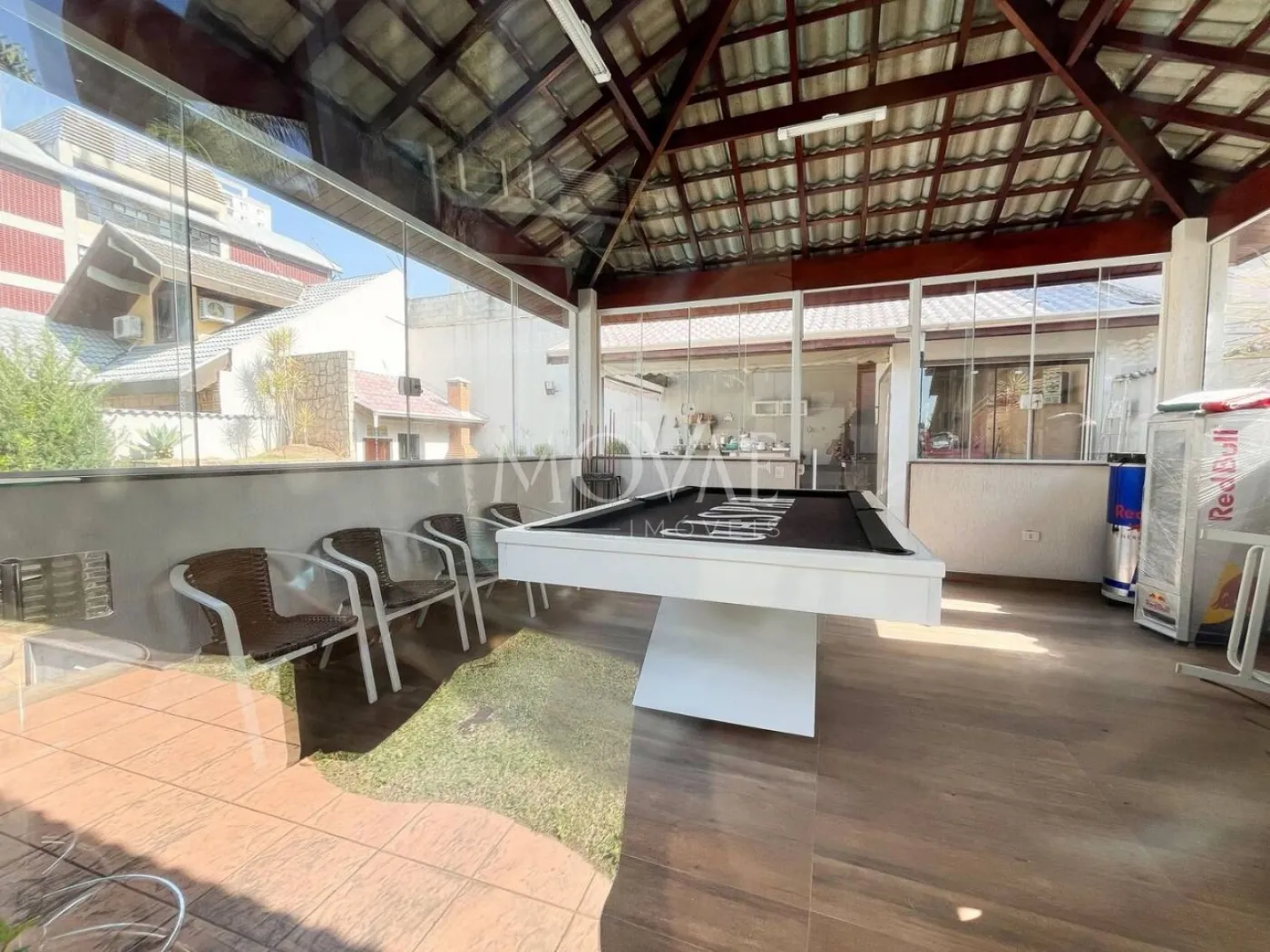 Área gourmet com churrasqueira e espaço para jogos