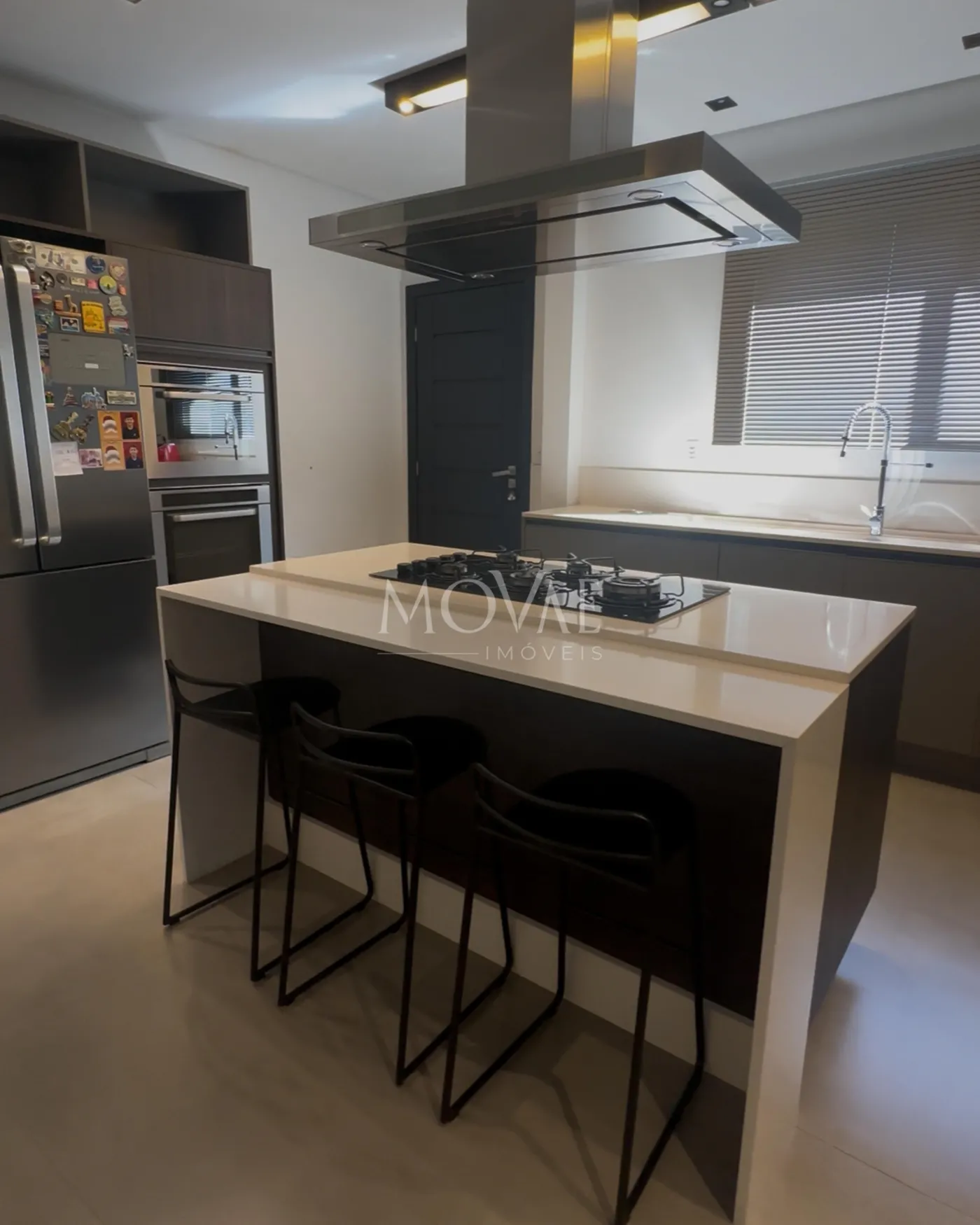 cozinha com ilha, fogão cooktop e coifa em inox