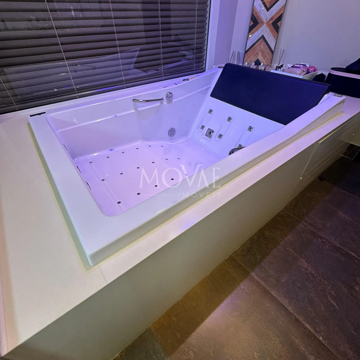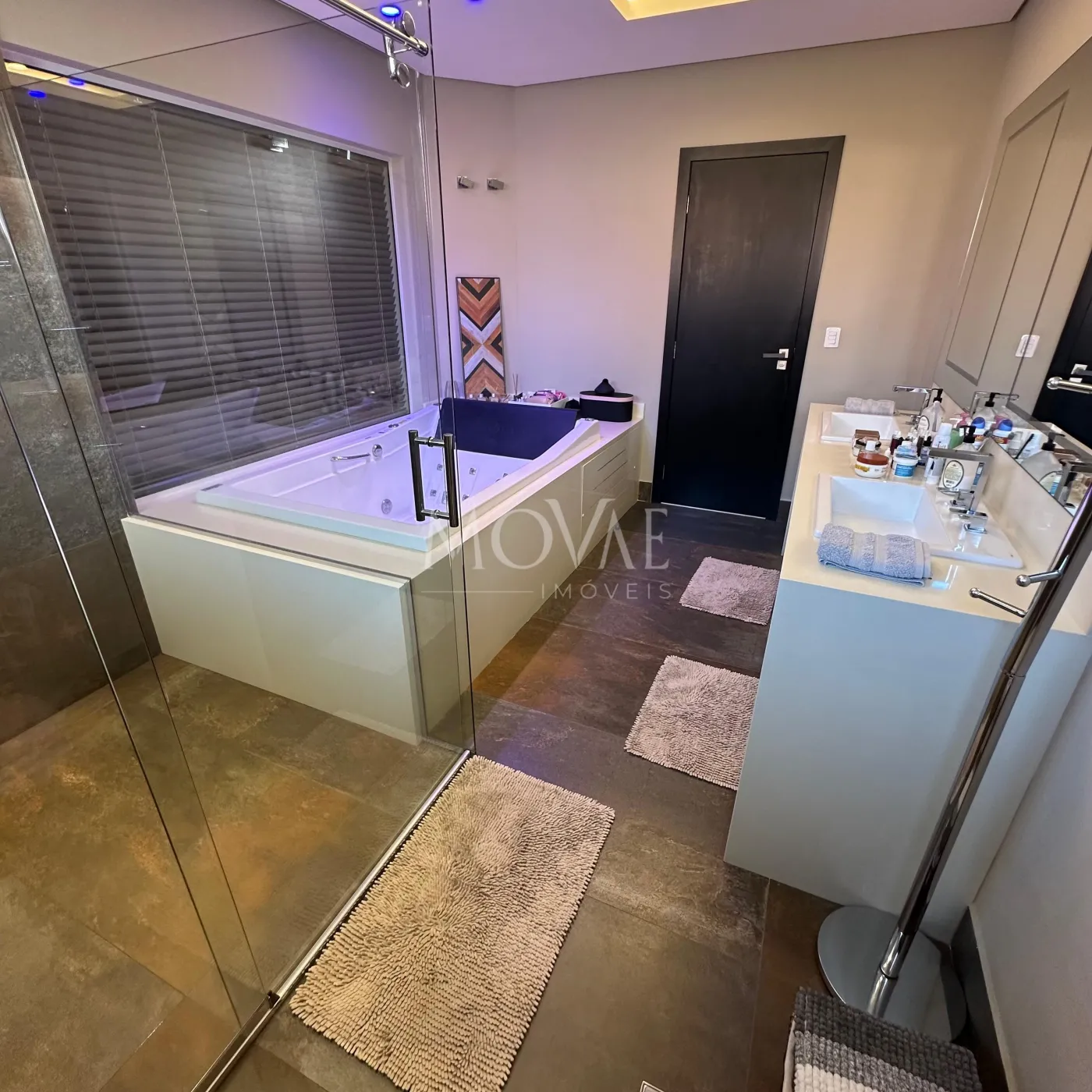 1 máster com closet e banheira de hidro dupla com iluminação de LED, box independente e fechado com blindex