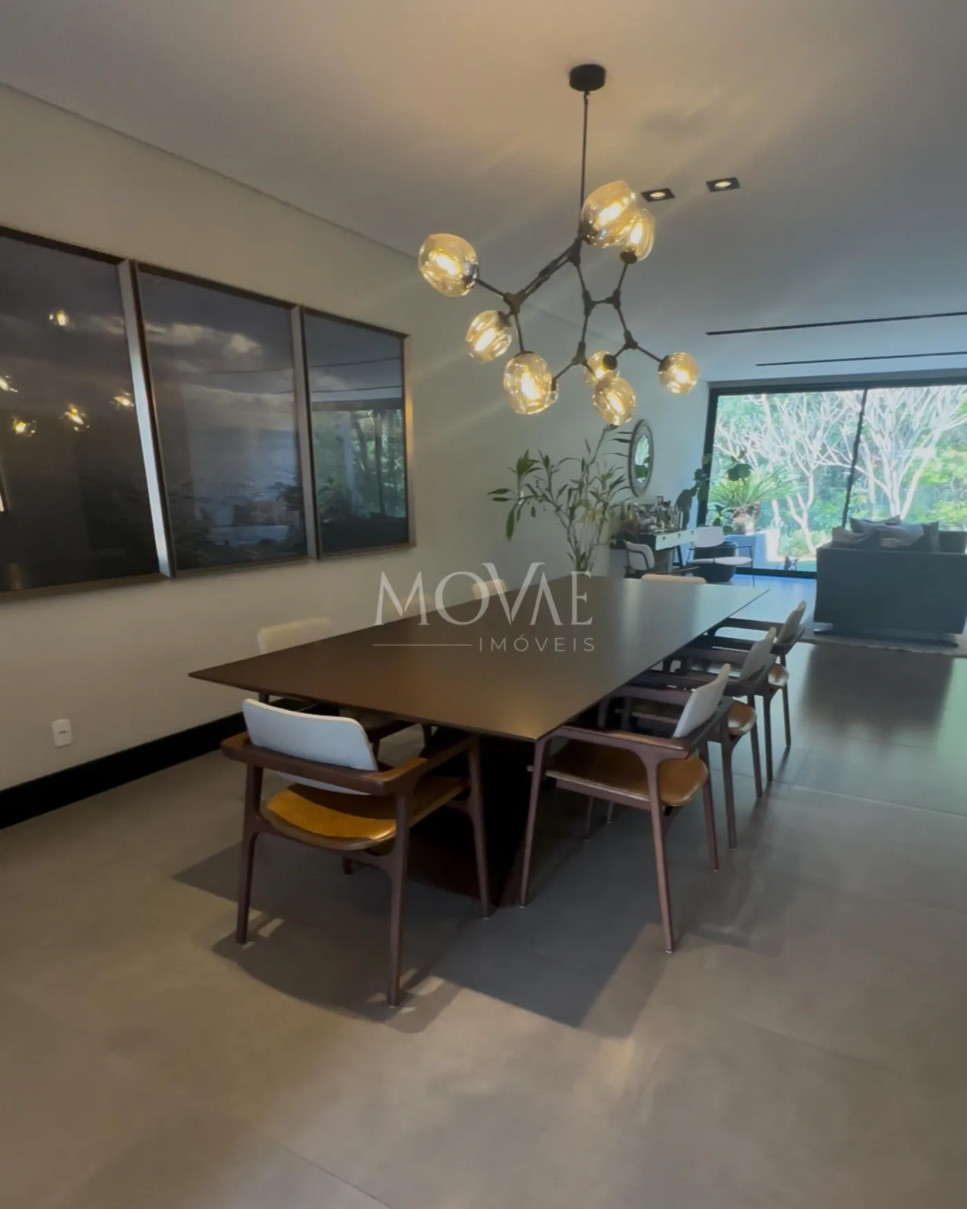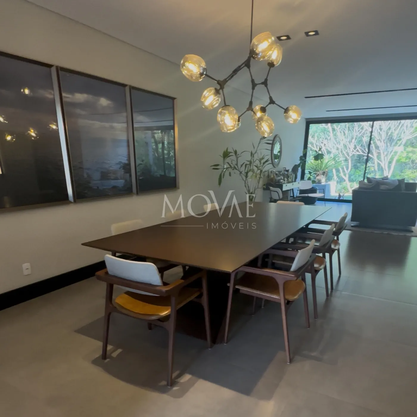 ampla sala conceito aberto com porta de correr de vidro com cortinas e lustres, ar condicionado
