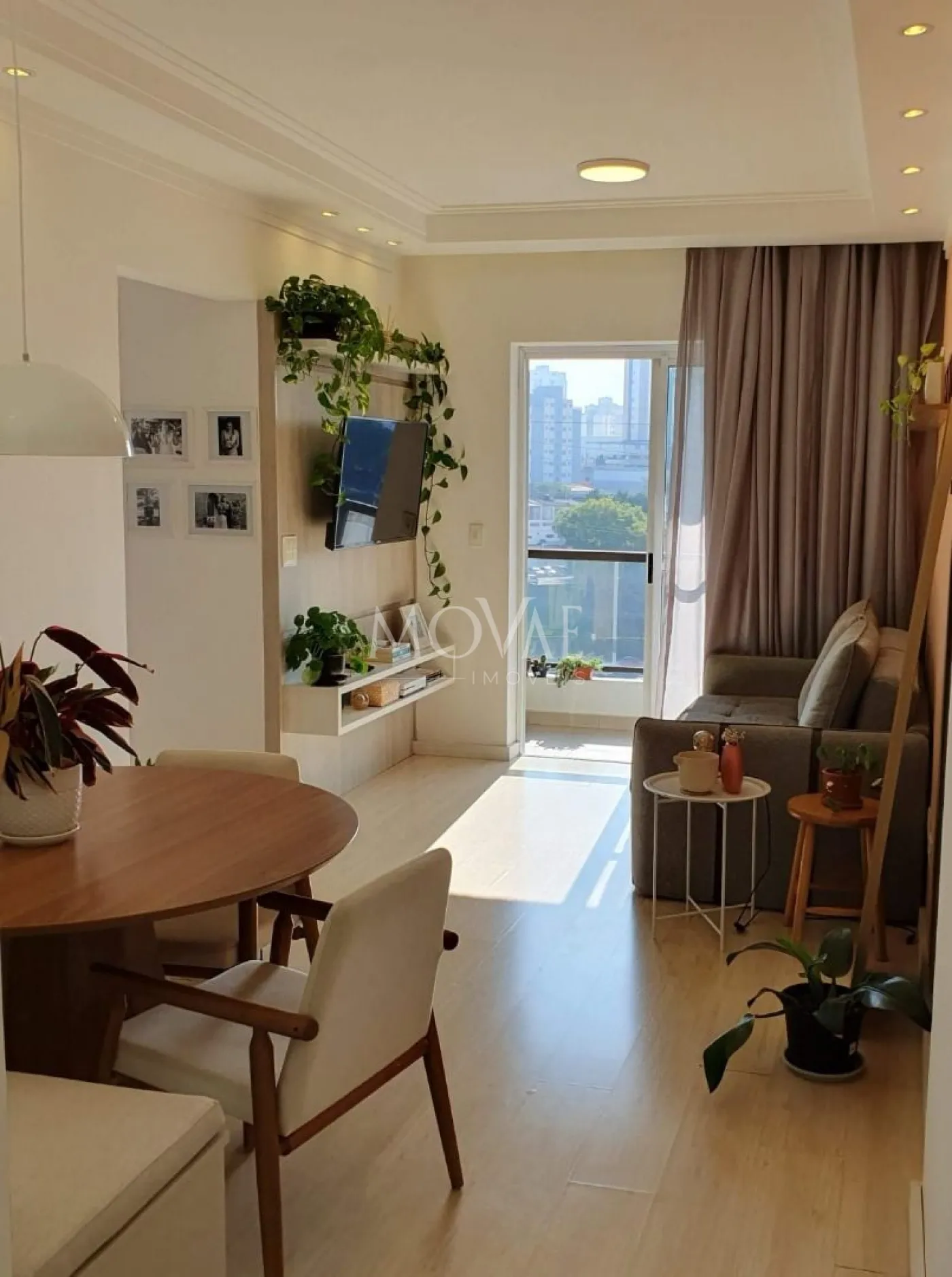 Sala estar com painel de tv planejado e pequena varanda