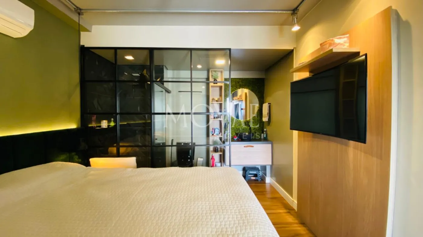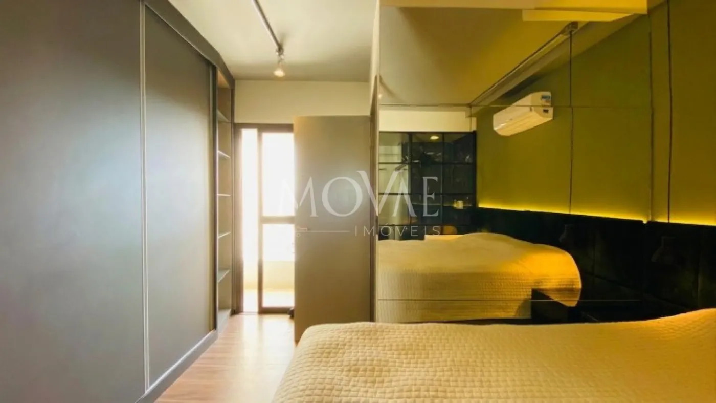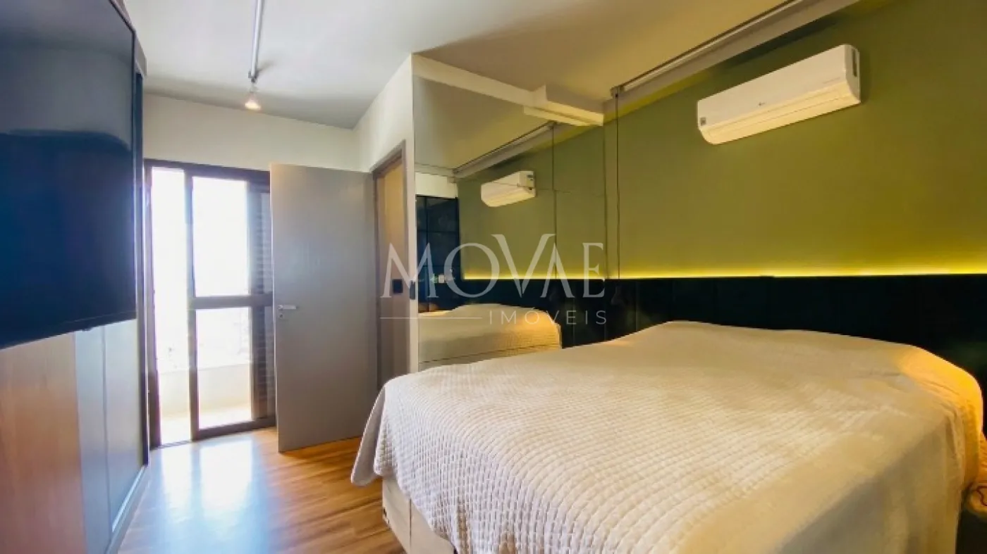Suíte master espaçosa, com acabamentos de alto padrão, ar-condicionado, sacada (atualmente utilizada como área técnica) e excelente privacidade