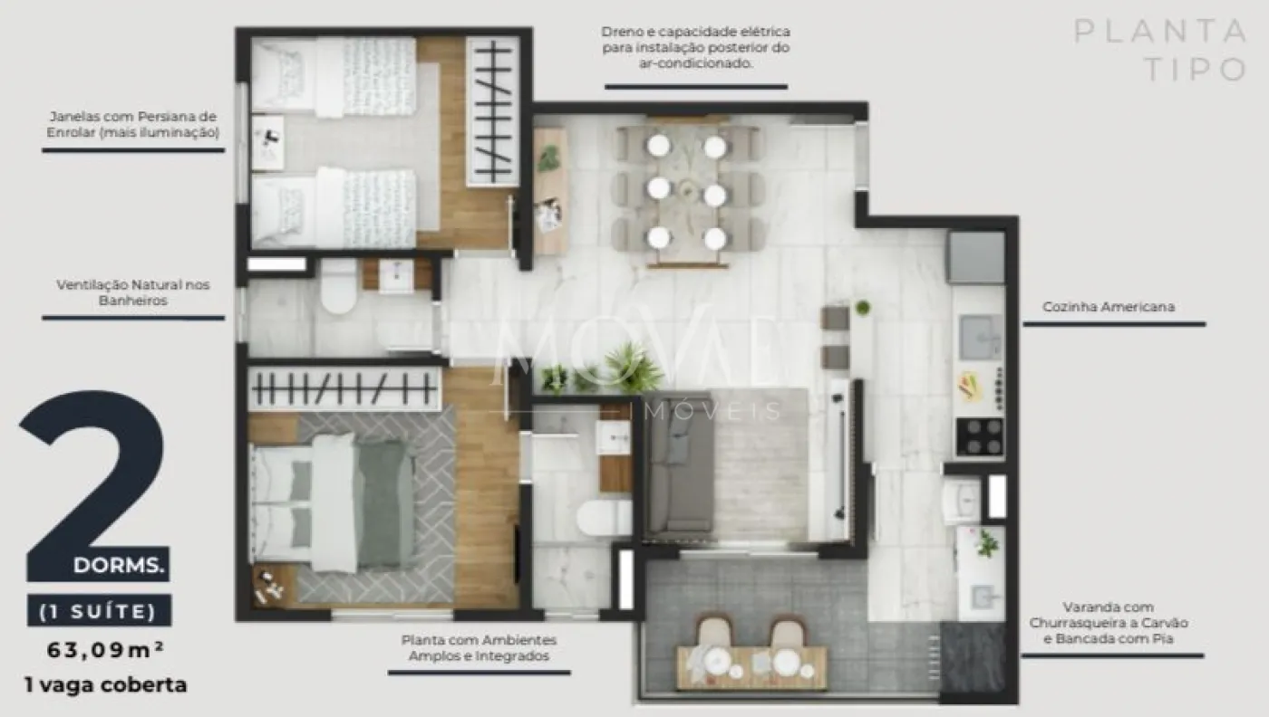2 Dormitórios, sendo 1 Suíte