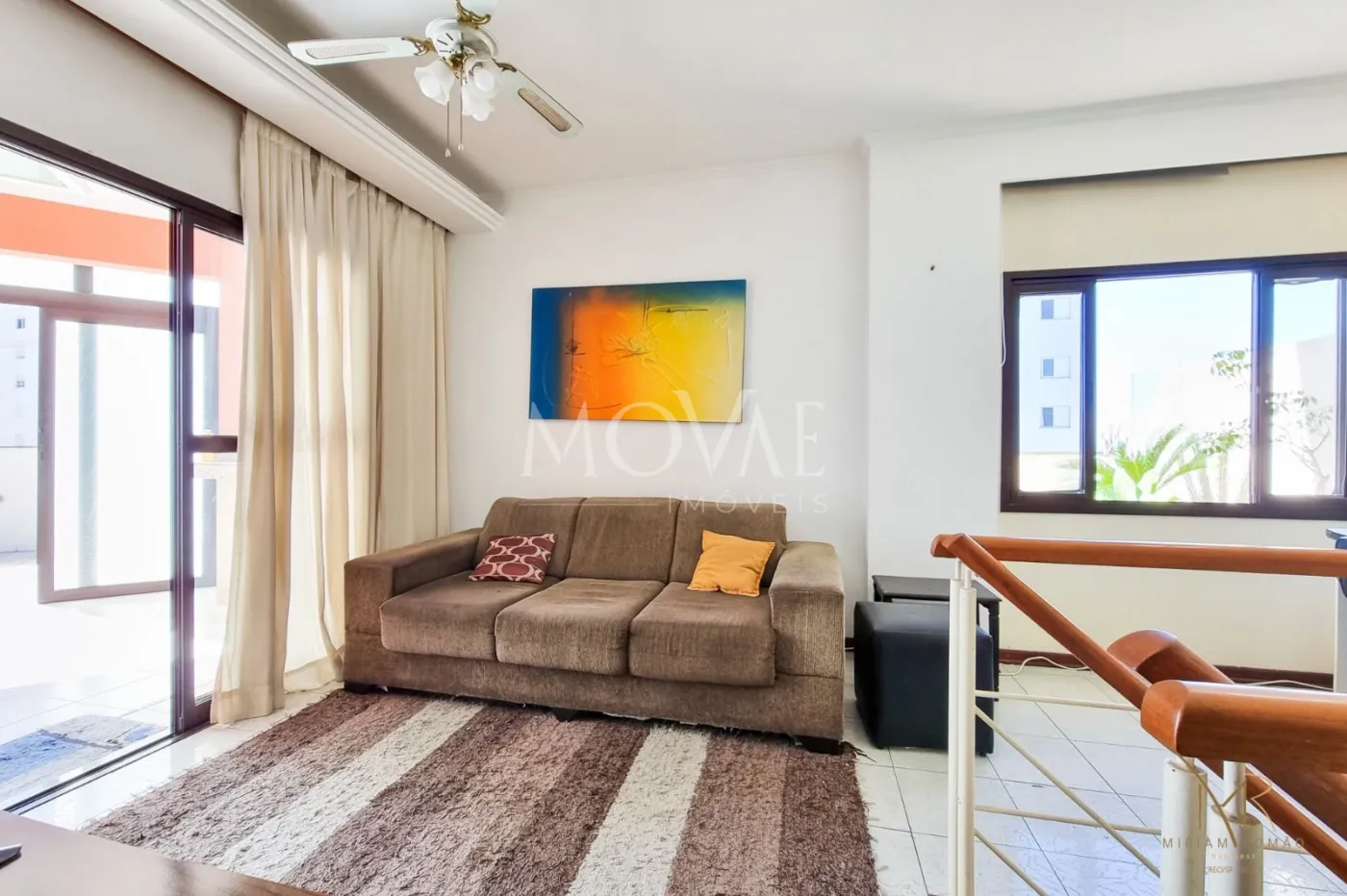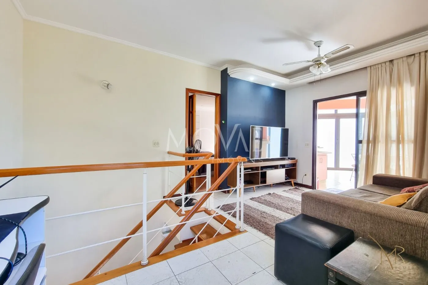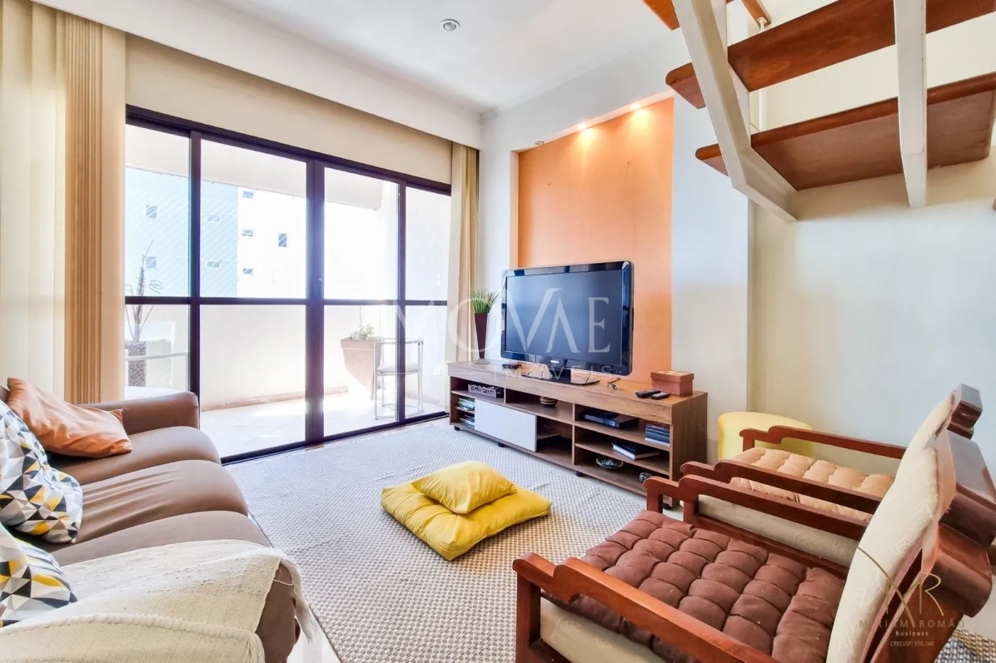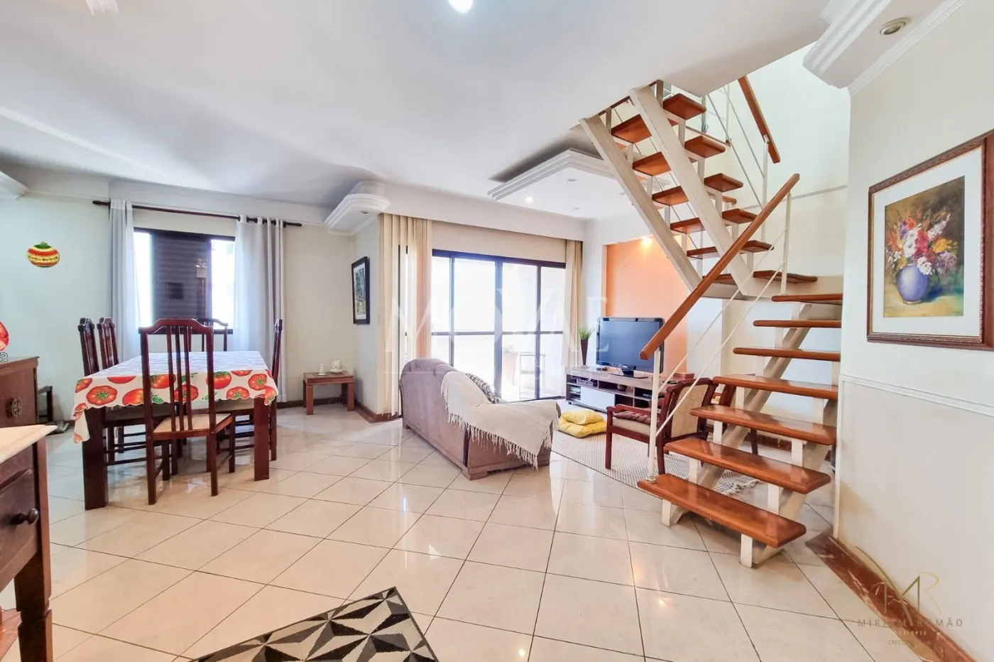 A cobertura duplex conta com duas salas de TV e uma sala de jantar, todas decoradas.