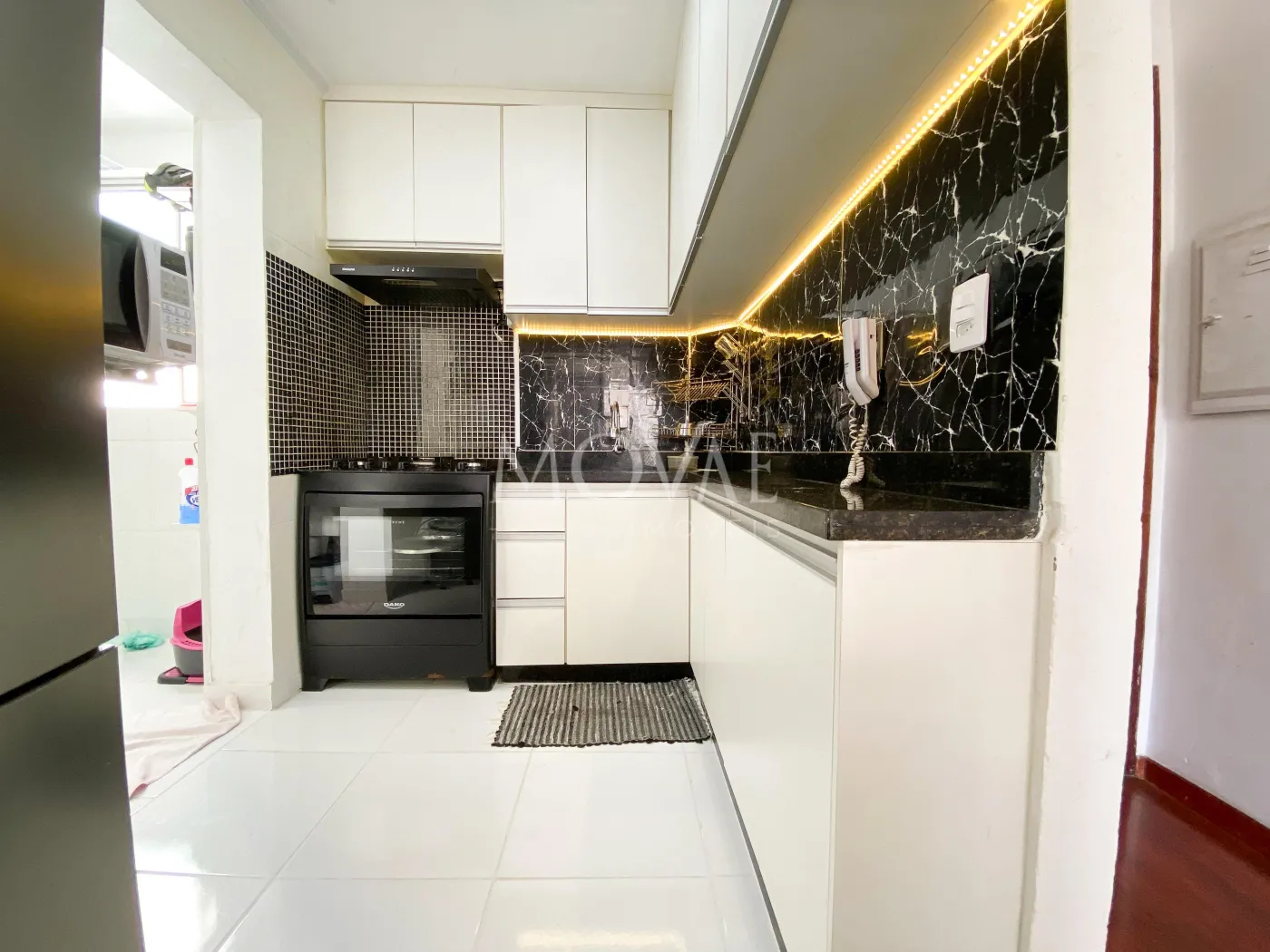 Cozinha americana com armários planejados;