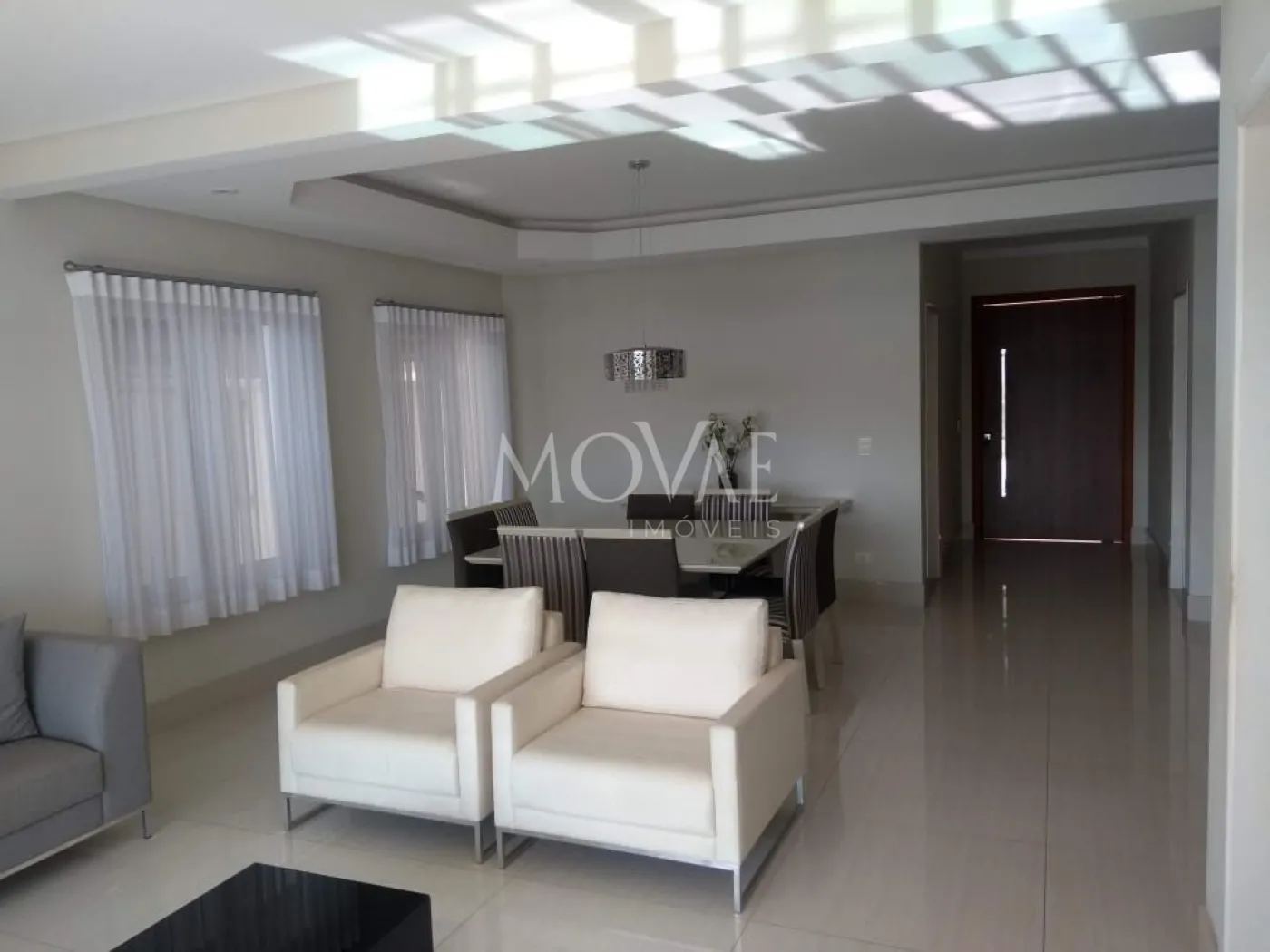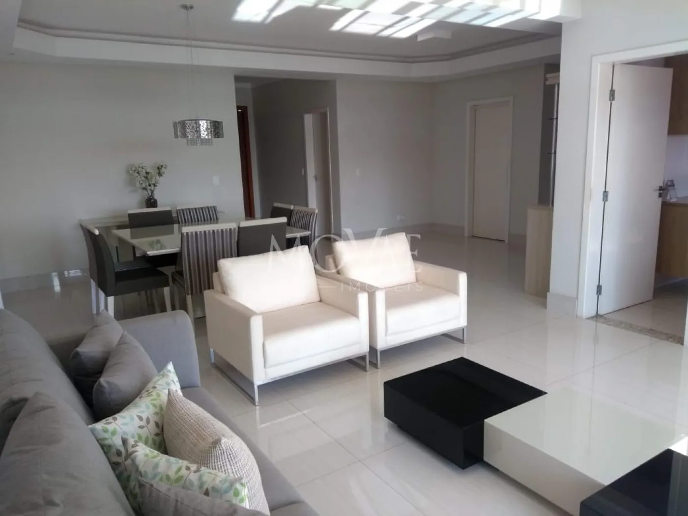 Sala de estar para três ambientes ampla e bem iluminada, proporcionando integração entre os espaços e um ambiente sofisticado.