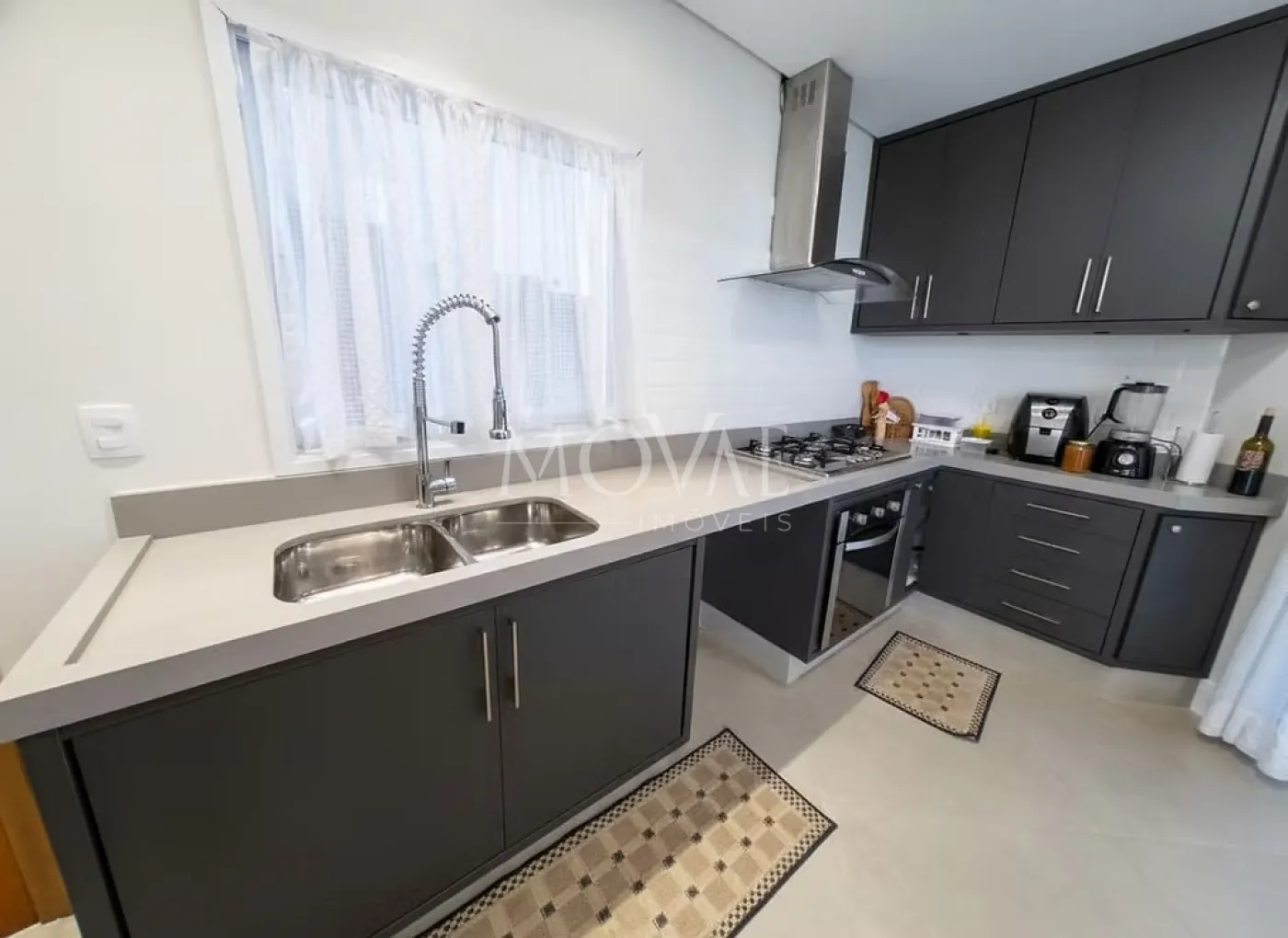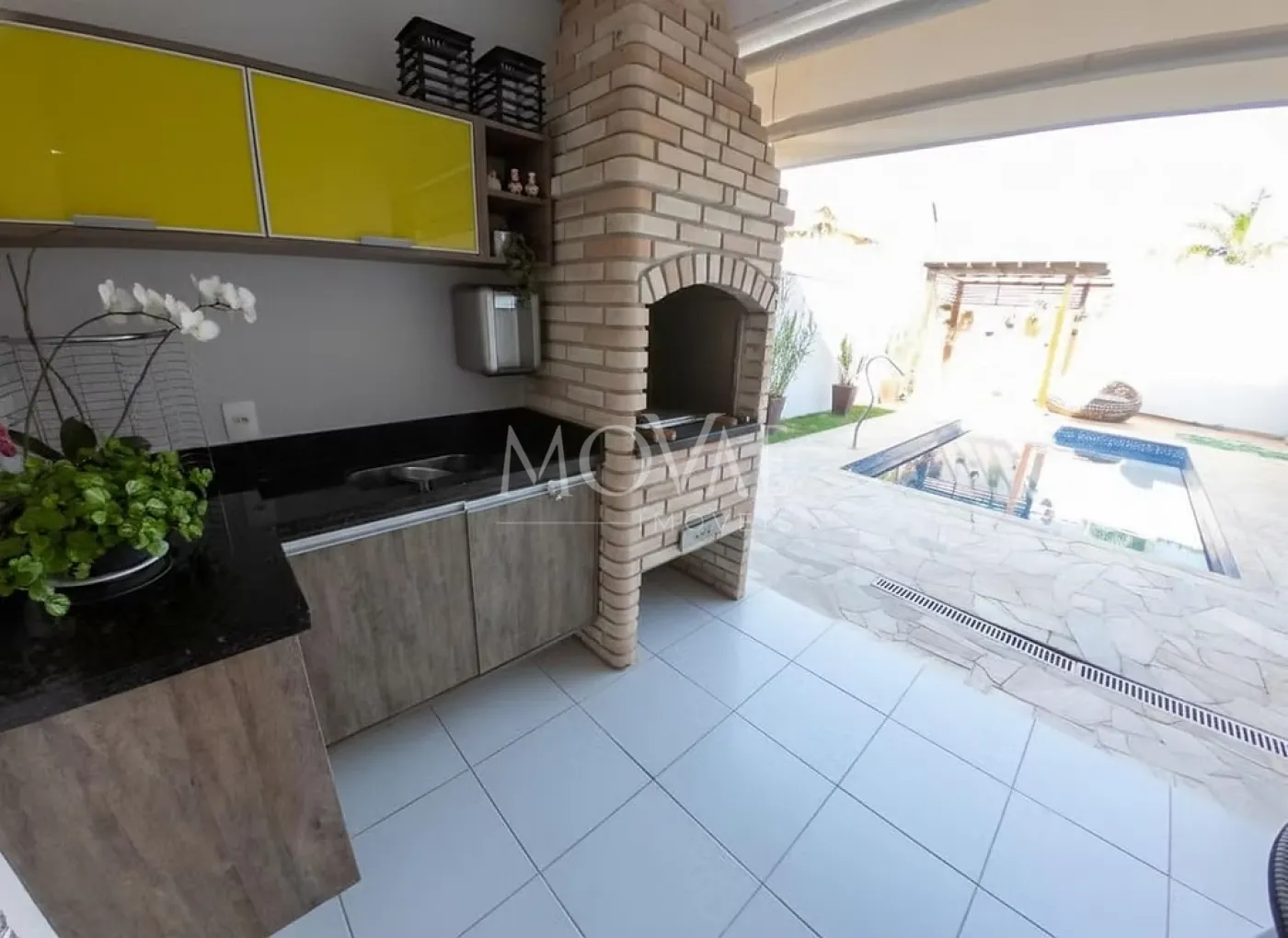 Cozinha em conceito aberto, integrada com a área gourmet e churrasqueira, criando um espaço ideal para quem ama cozinhar e receber.