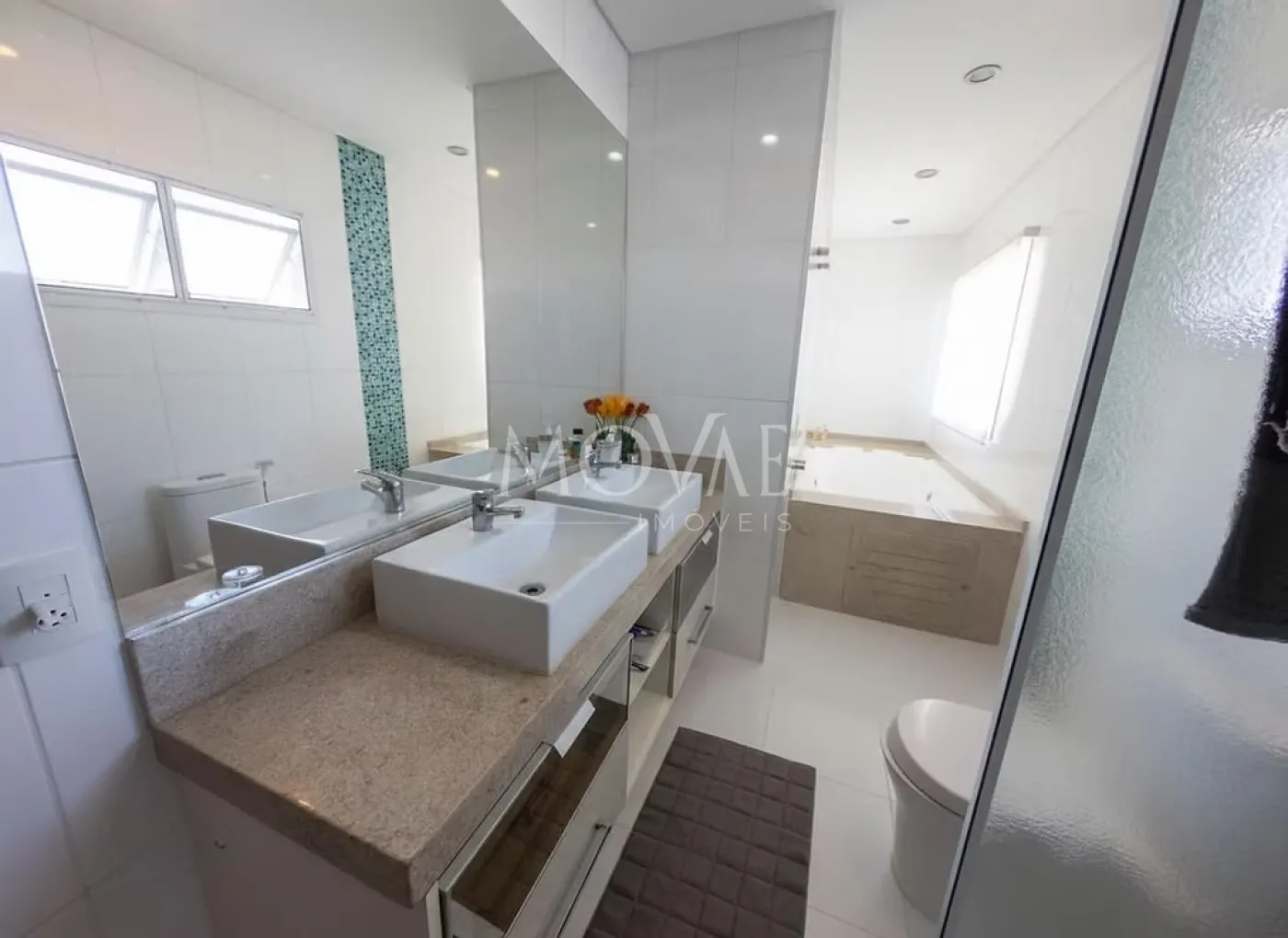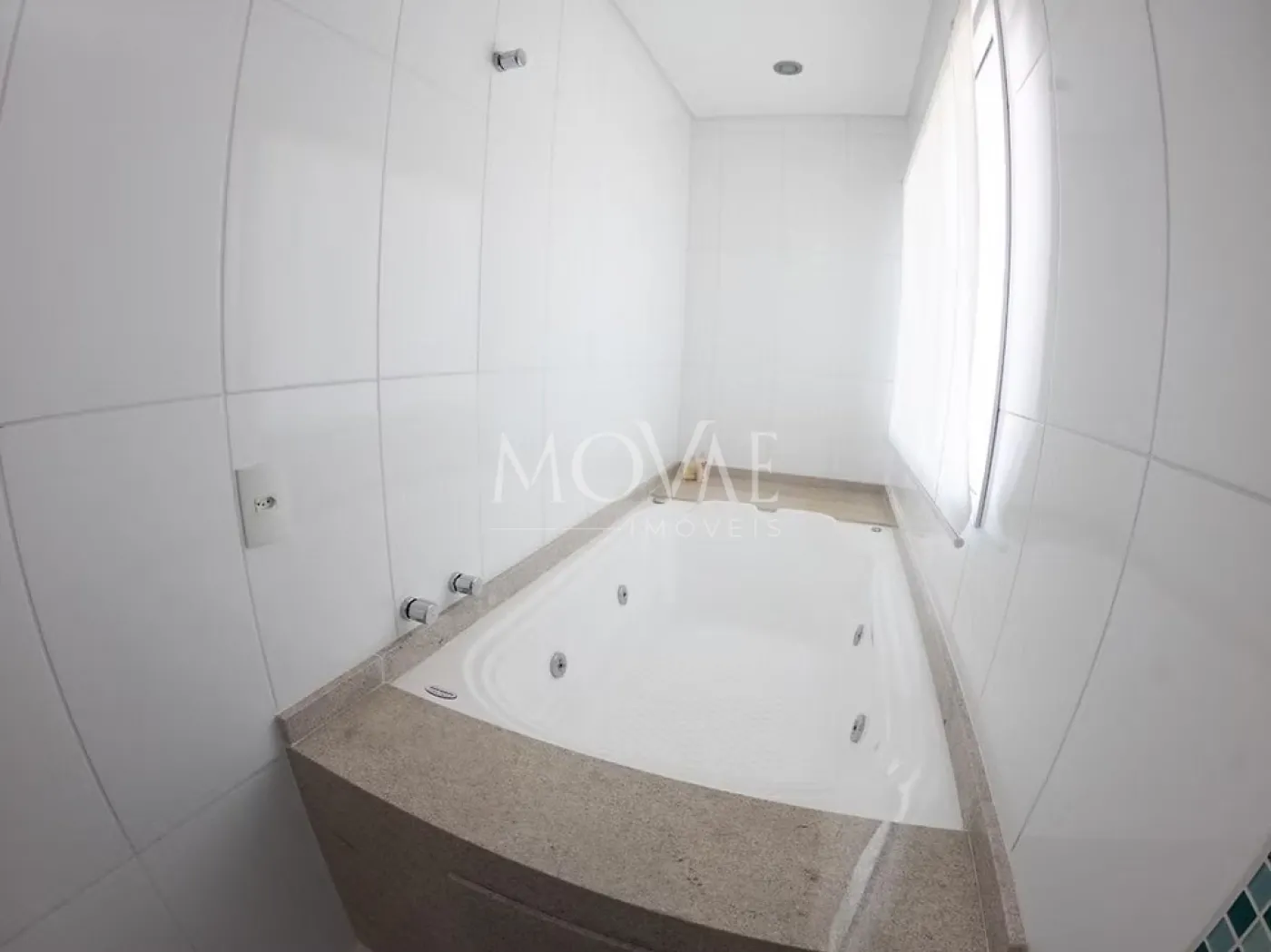 Suíte Master com generoso espaço, closet planejado, banheiro com duas pias, duplo chuveiro, banheira de hidromassagem e sacada privativa com vista panorâmica.