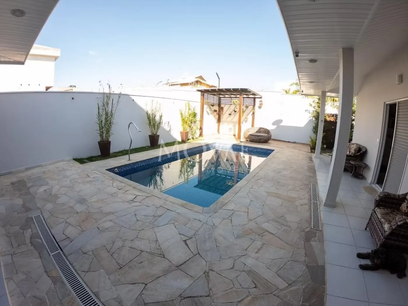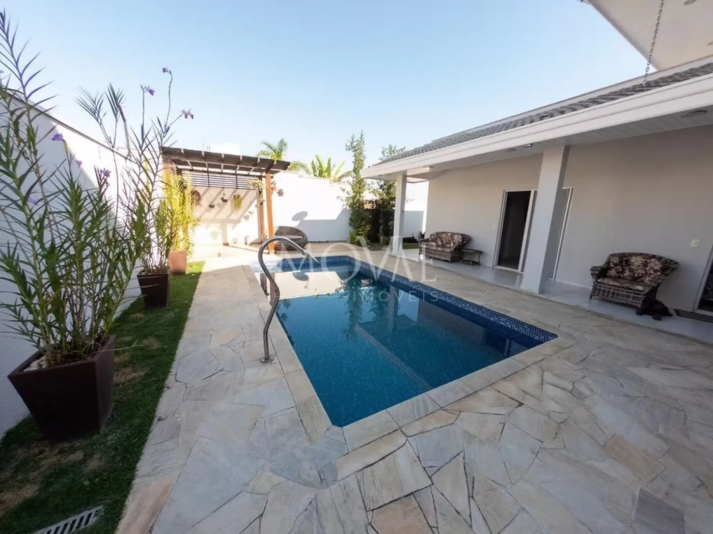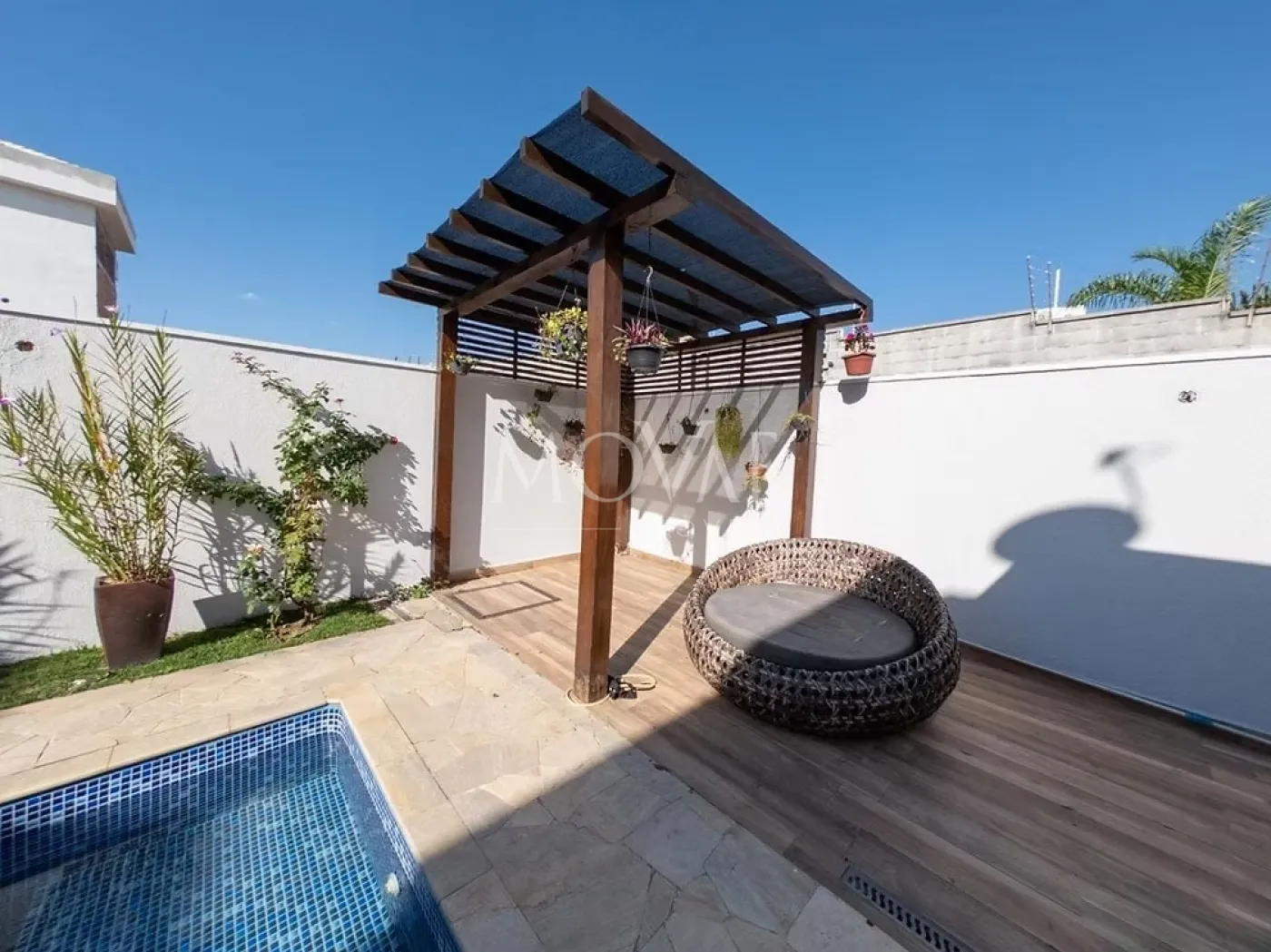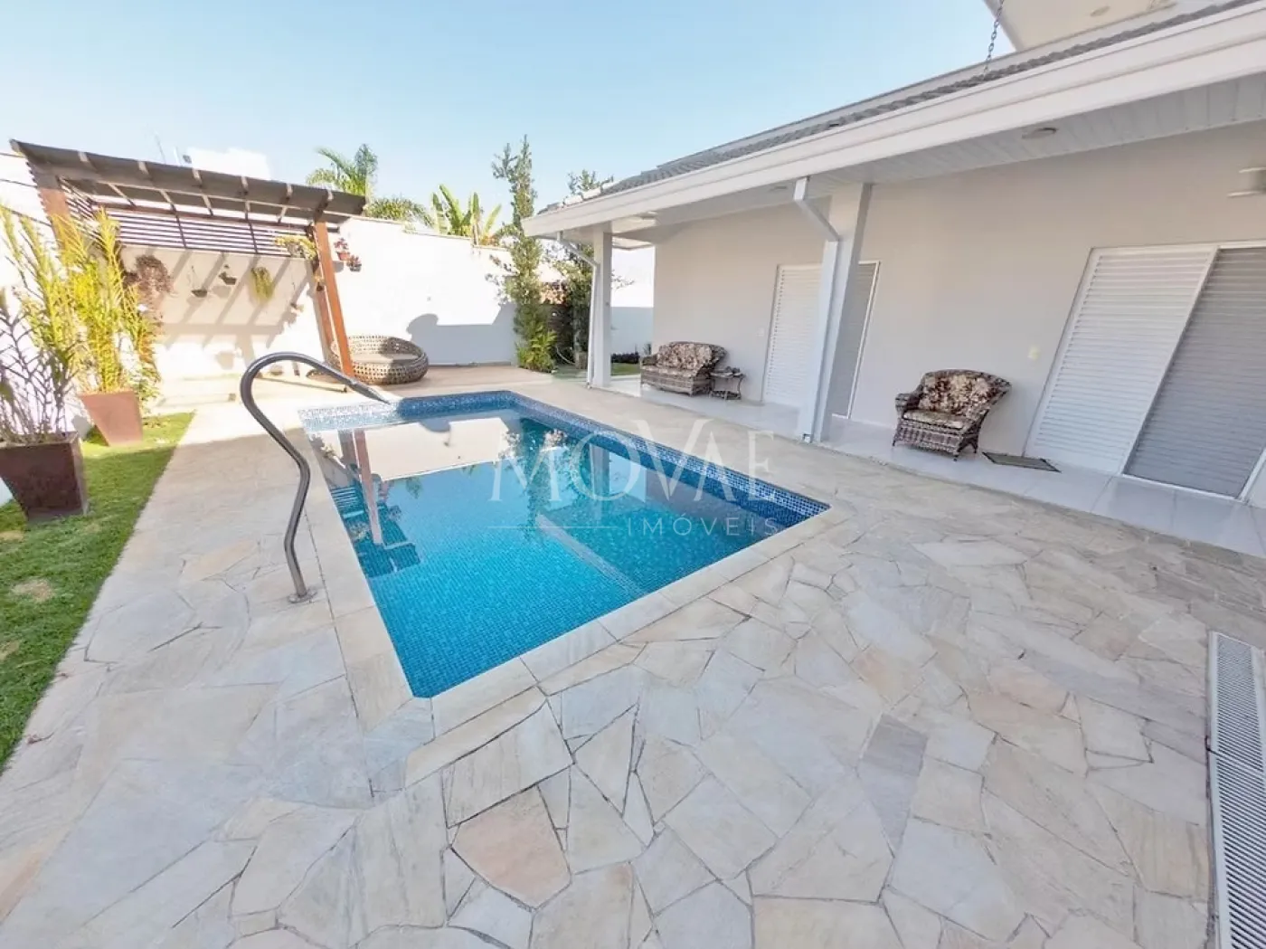 Piscina com prainha, perfeita para relaxar nos dias quentes, além de deck em madeira, ideal para espreguiçadeiras e momentos ao sol.