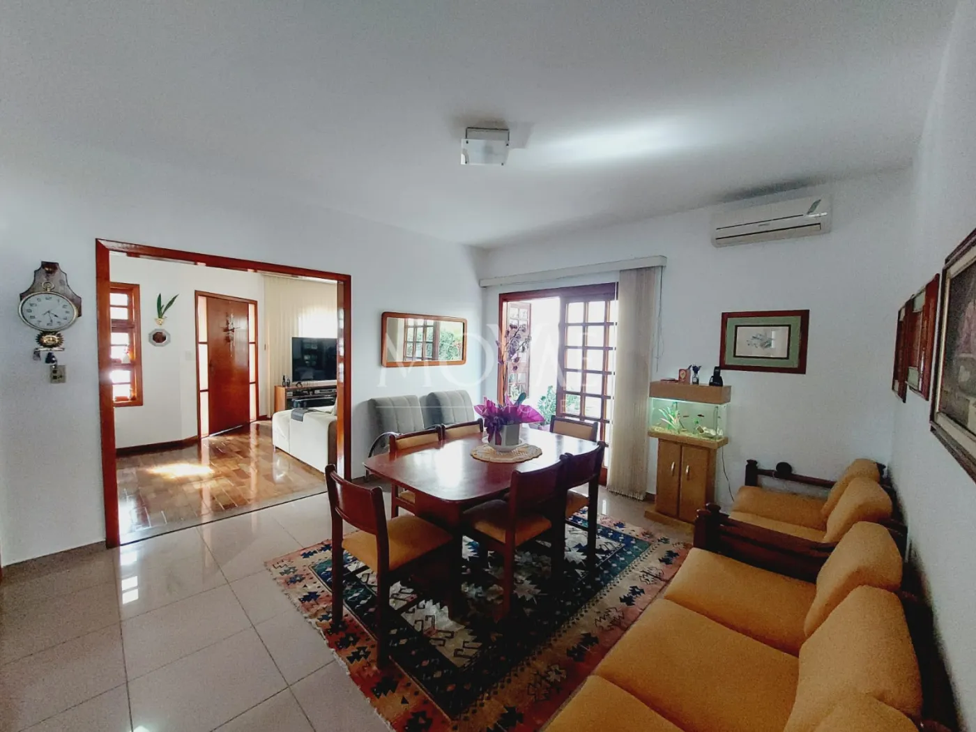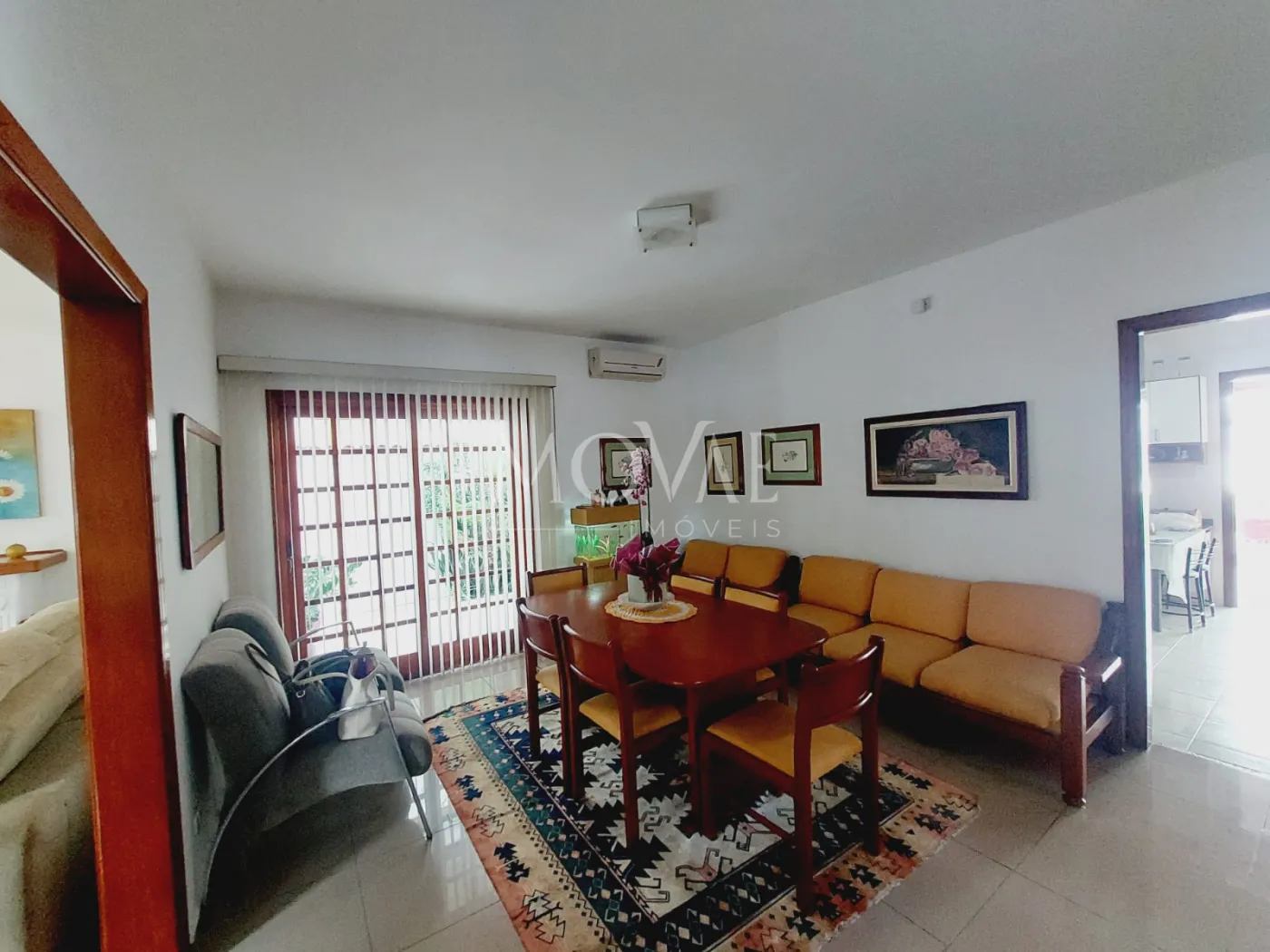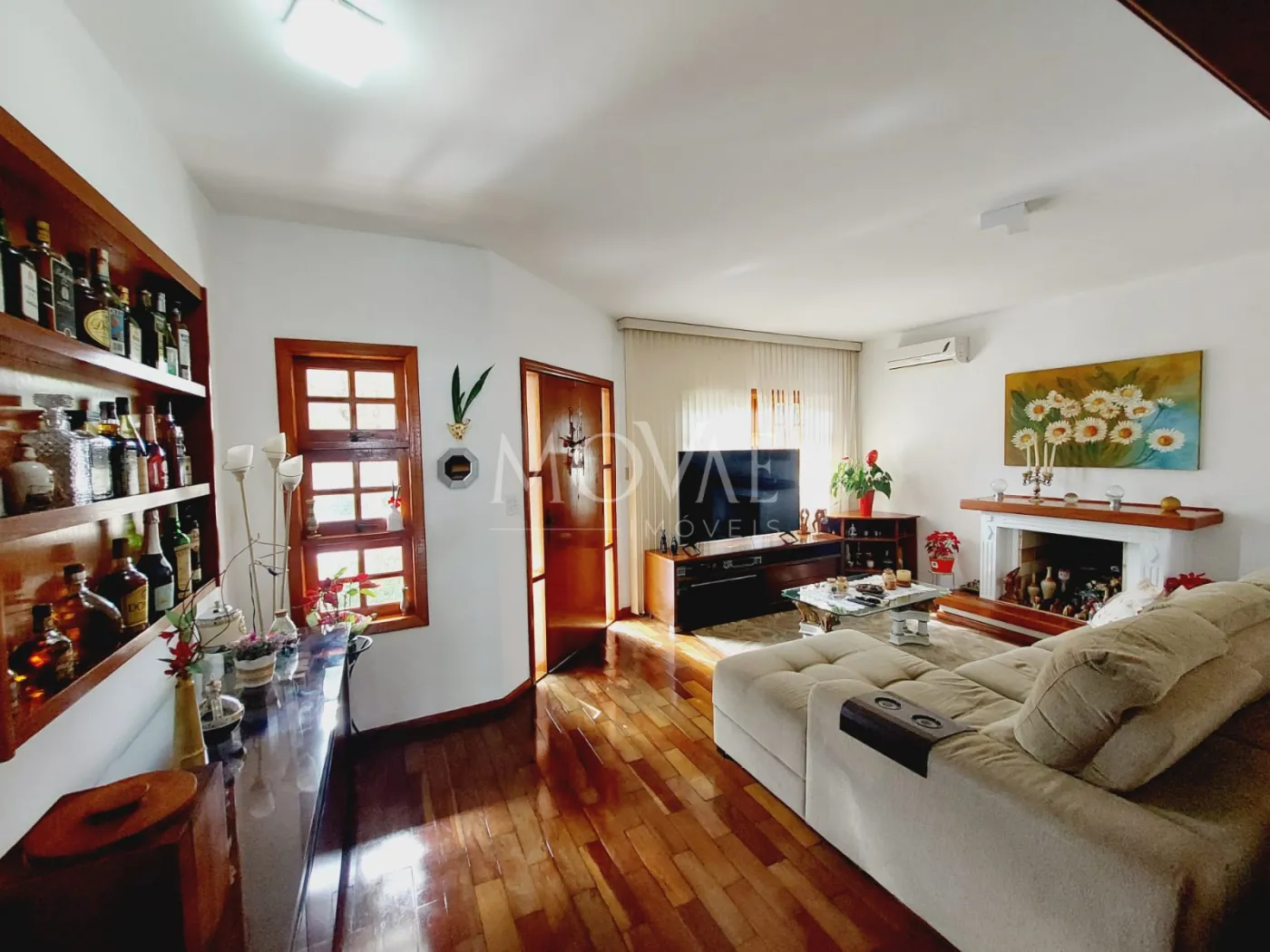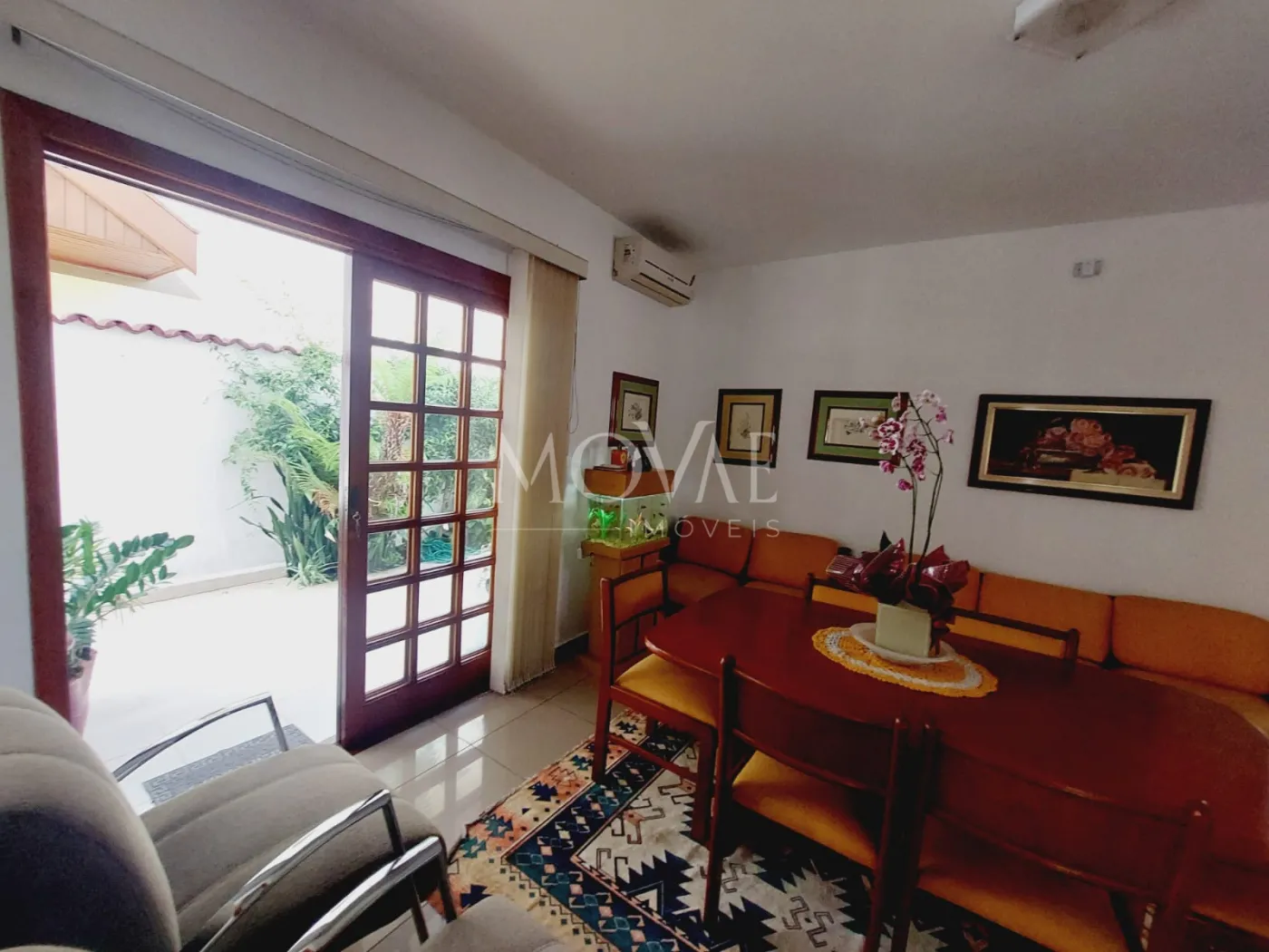 Sala para 3 ambientes - conceito integrado, lareira, ar-condicionado e porta de correr que se abre para a varanda e o jardim