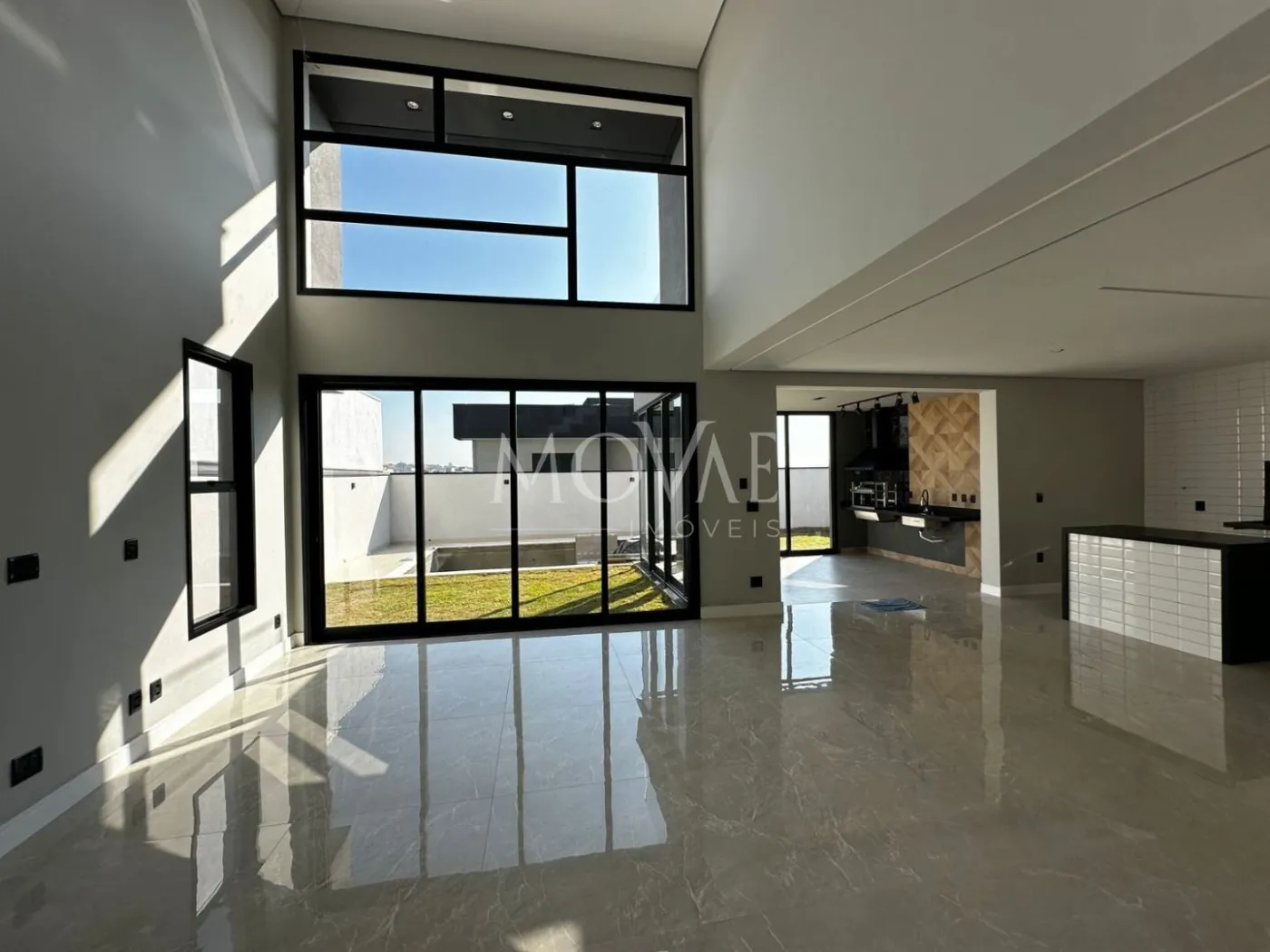 Pé direito duplo com bastante iluminação natural, janelas e portas grandes, ambientes com teto rebaixado em gesso e forro madeira área externa, iluminação em Led, com acabamento de primeira linha em toda residência.