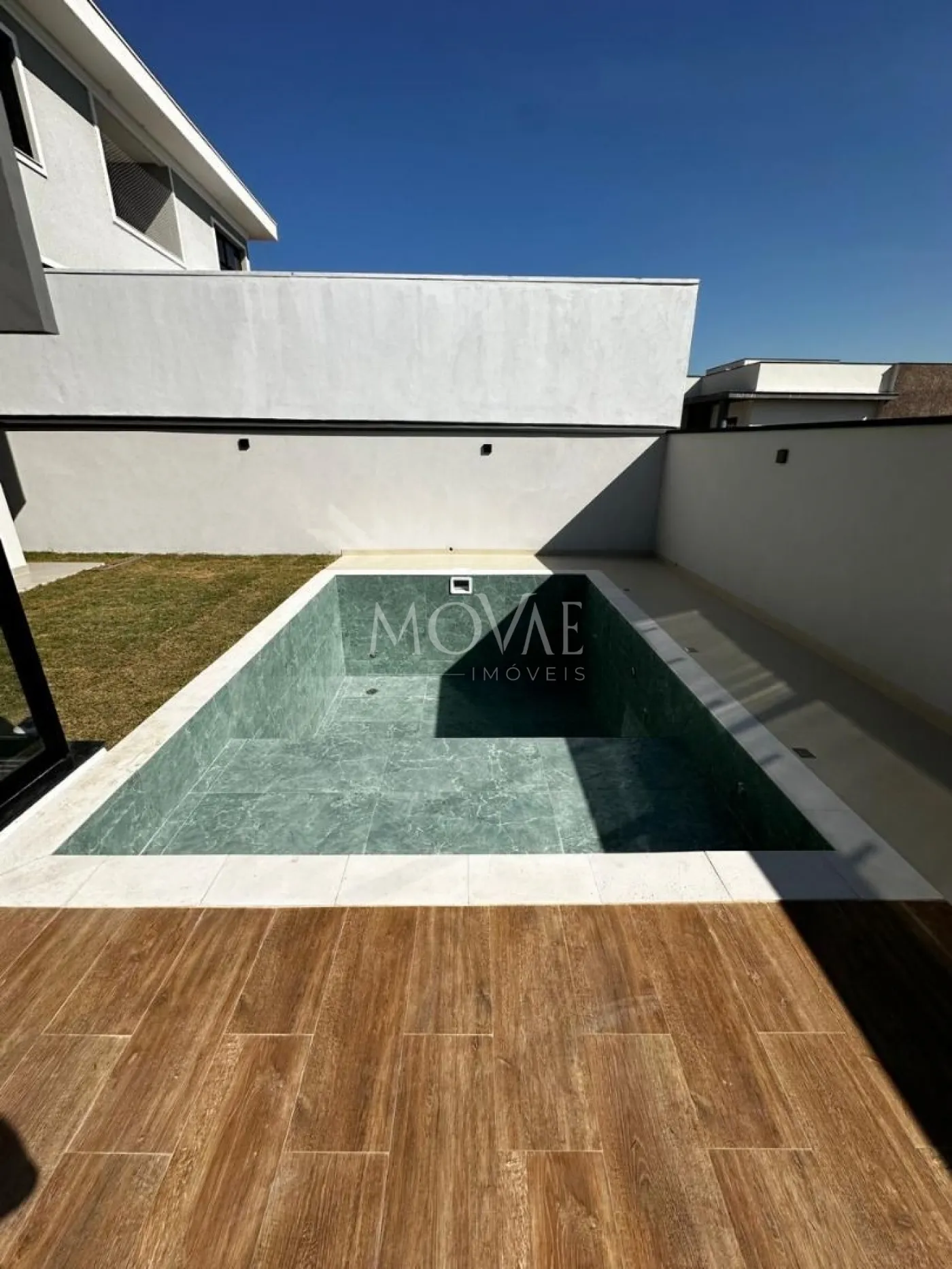 - Piscina construída em estrutura de alvenaria e revestida de porcelanato medindo 6,00x3,50