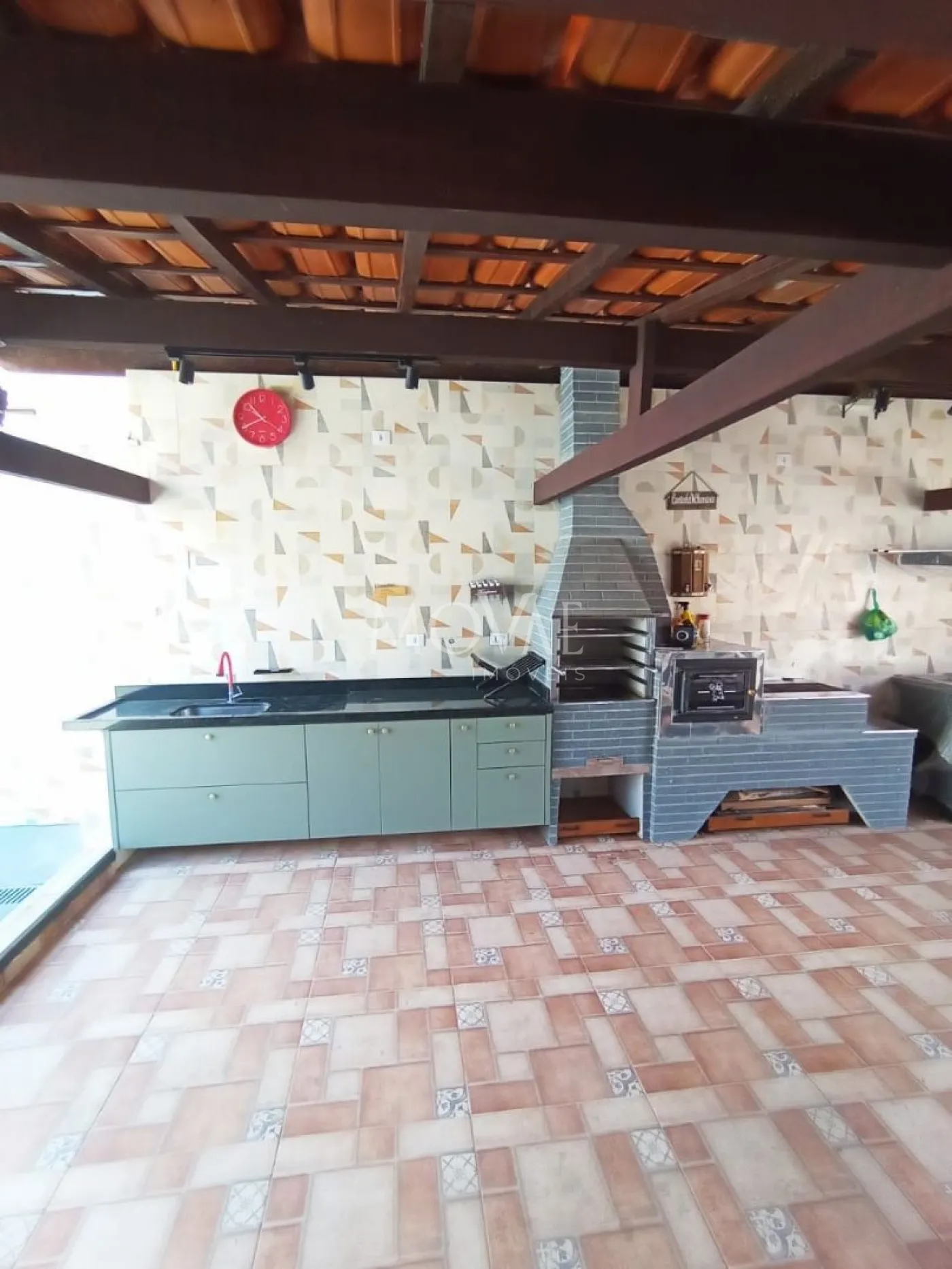 Área gourmet com churrasqueira e fogão a lenha.