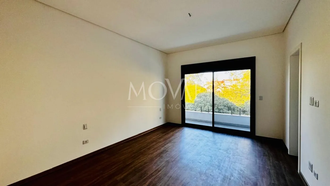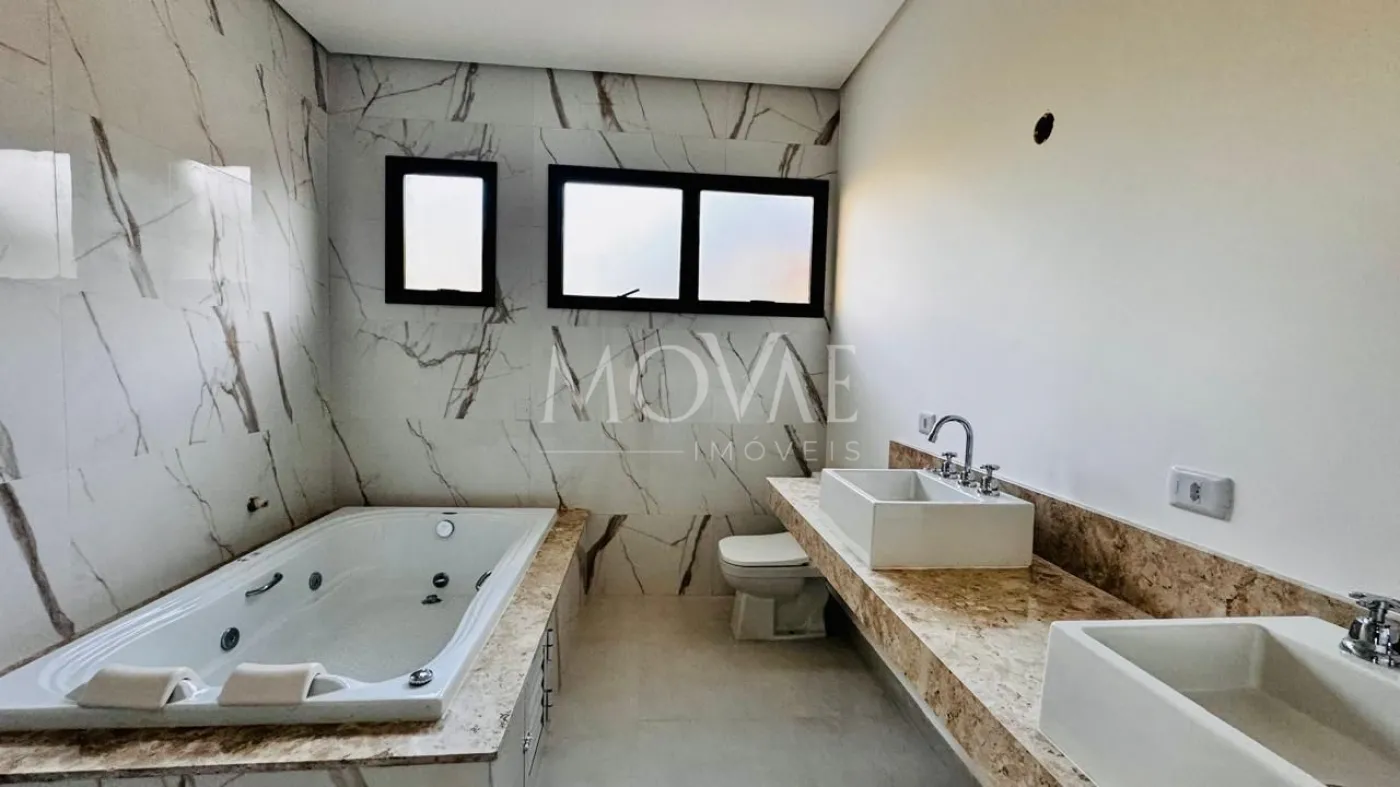 Suíte Master com generoso espaço, closet planejado, banheiro com duas pias, duplo chuveiro, banheira de hidromassagem e sacada privativa com vista panorâmica.
