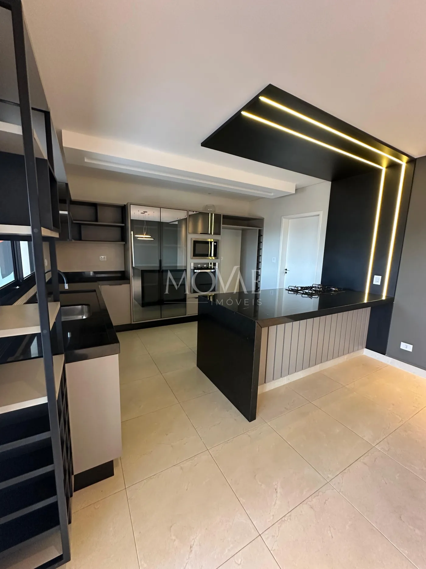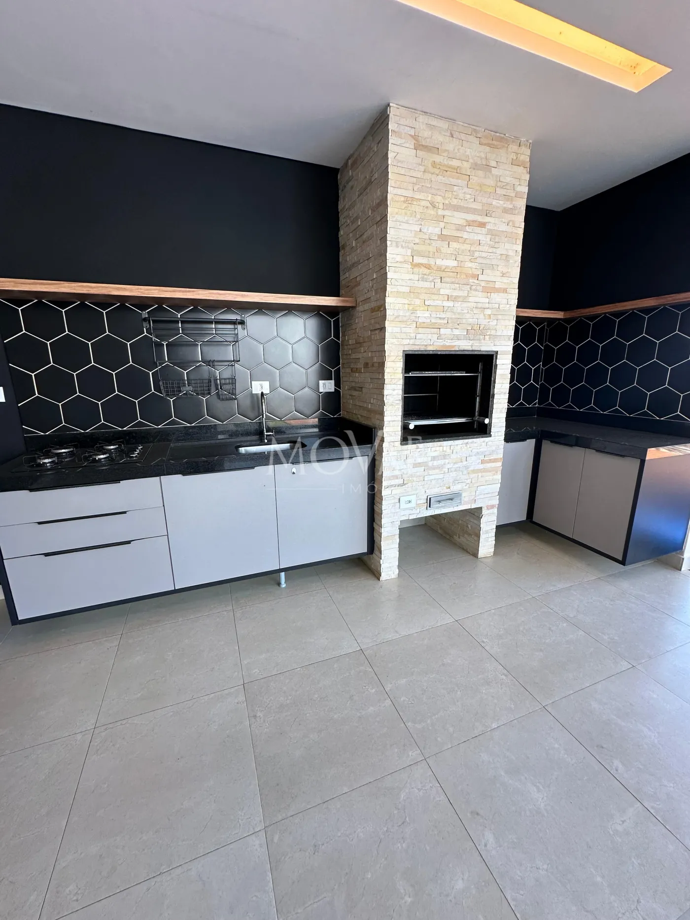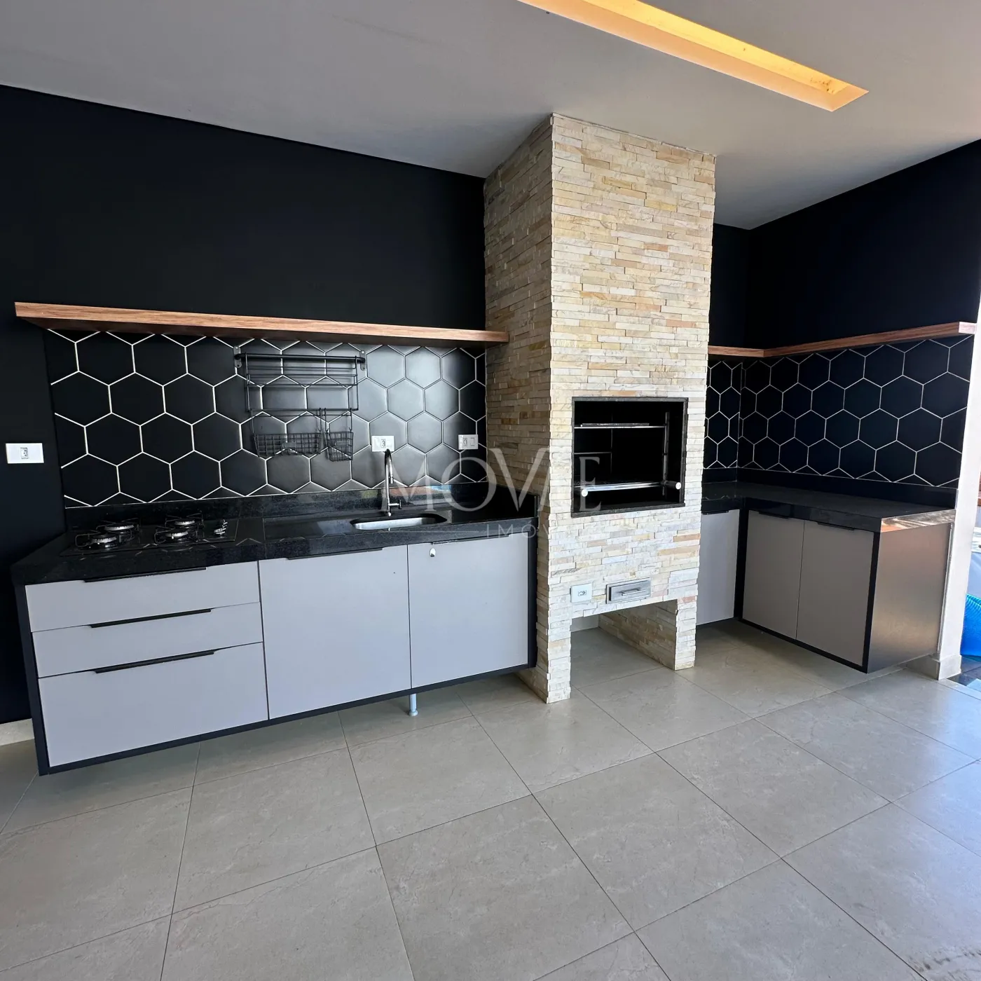 Cozinha em conceito aberto, integrada com a área gourmet e churrasqueira, criando um espaço ideal para quem ama cozinhar e receber.