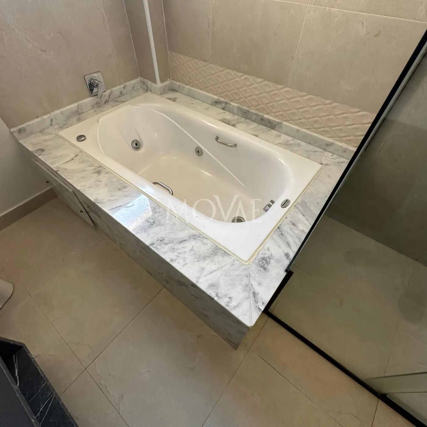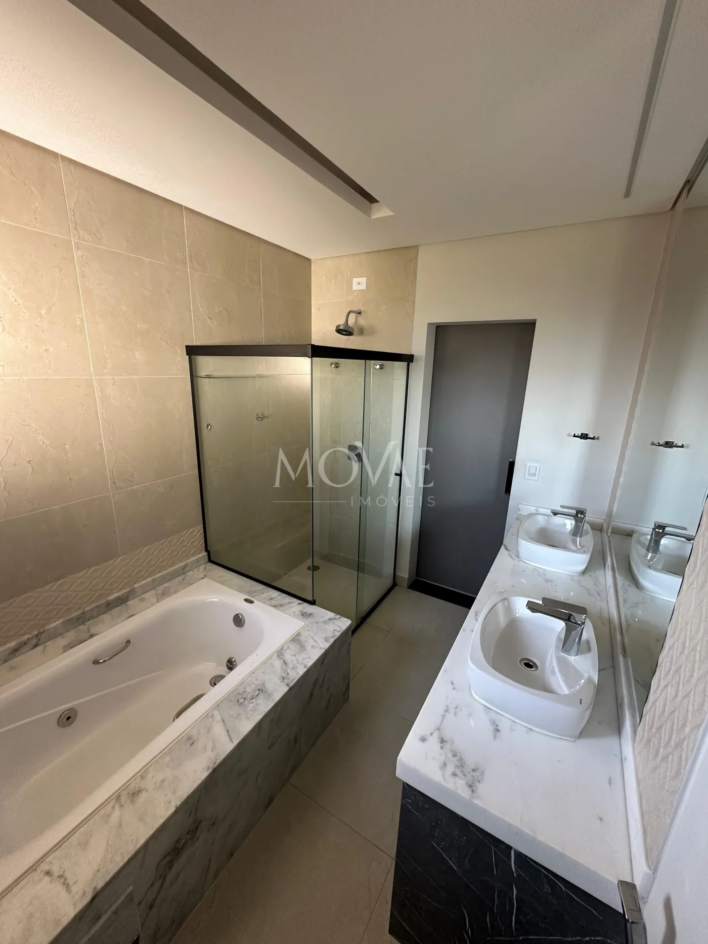 Suíte Master com generoso espaço, closet planejado, banheiro com duas pias, duplo chuveiro, banheira de hidromassagem e sacada privativa com vista panorâmica.