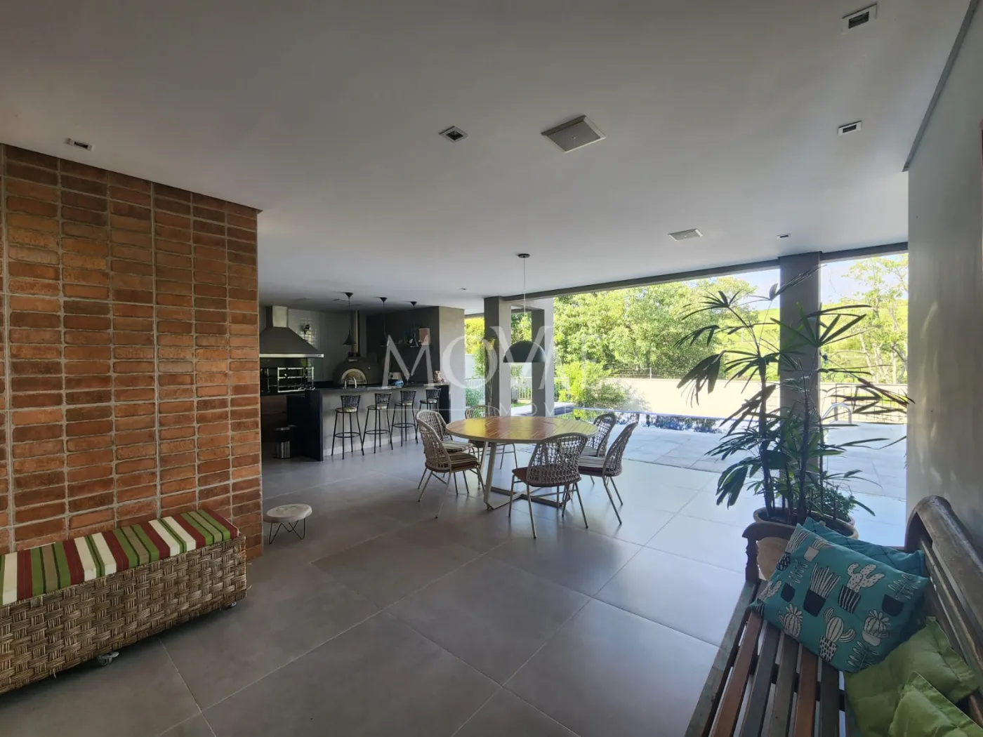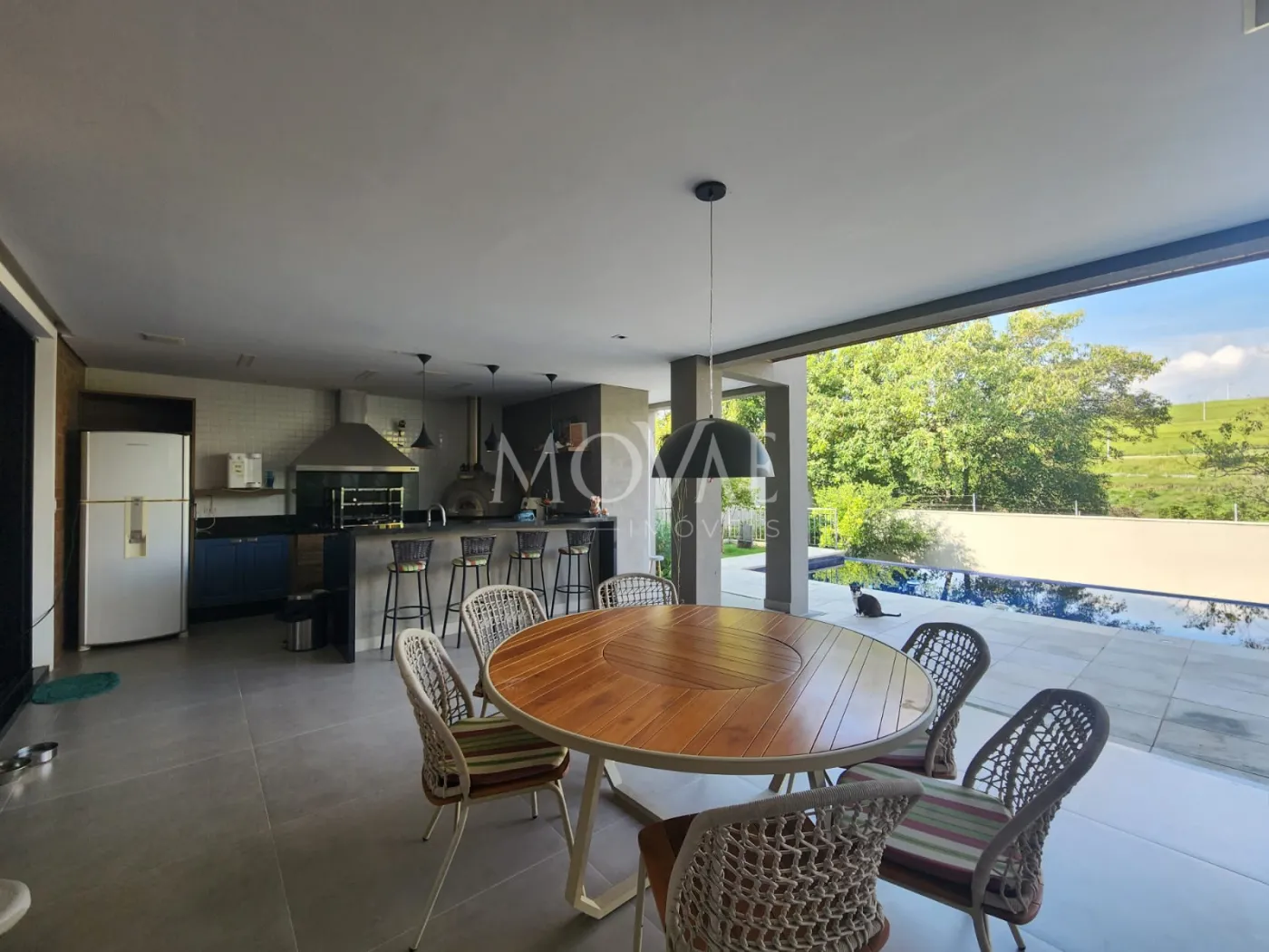 - Área gourmet com churrasqueira, fogão cooktop e forno de pizza