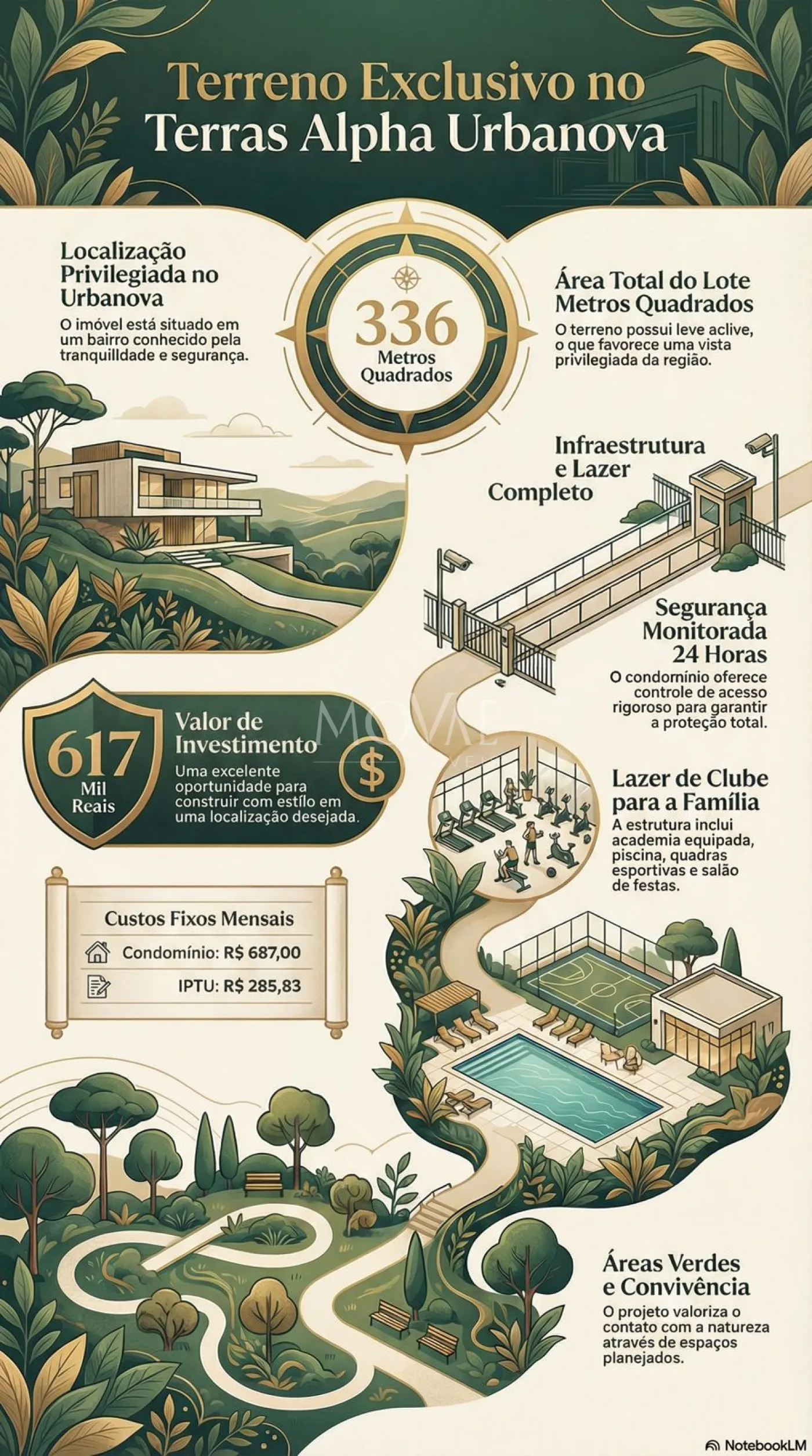 O terreno possui 336 m², com leve aclive, ideal para projetos que valorizam fachada imponente e vista privilegiada.