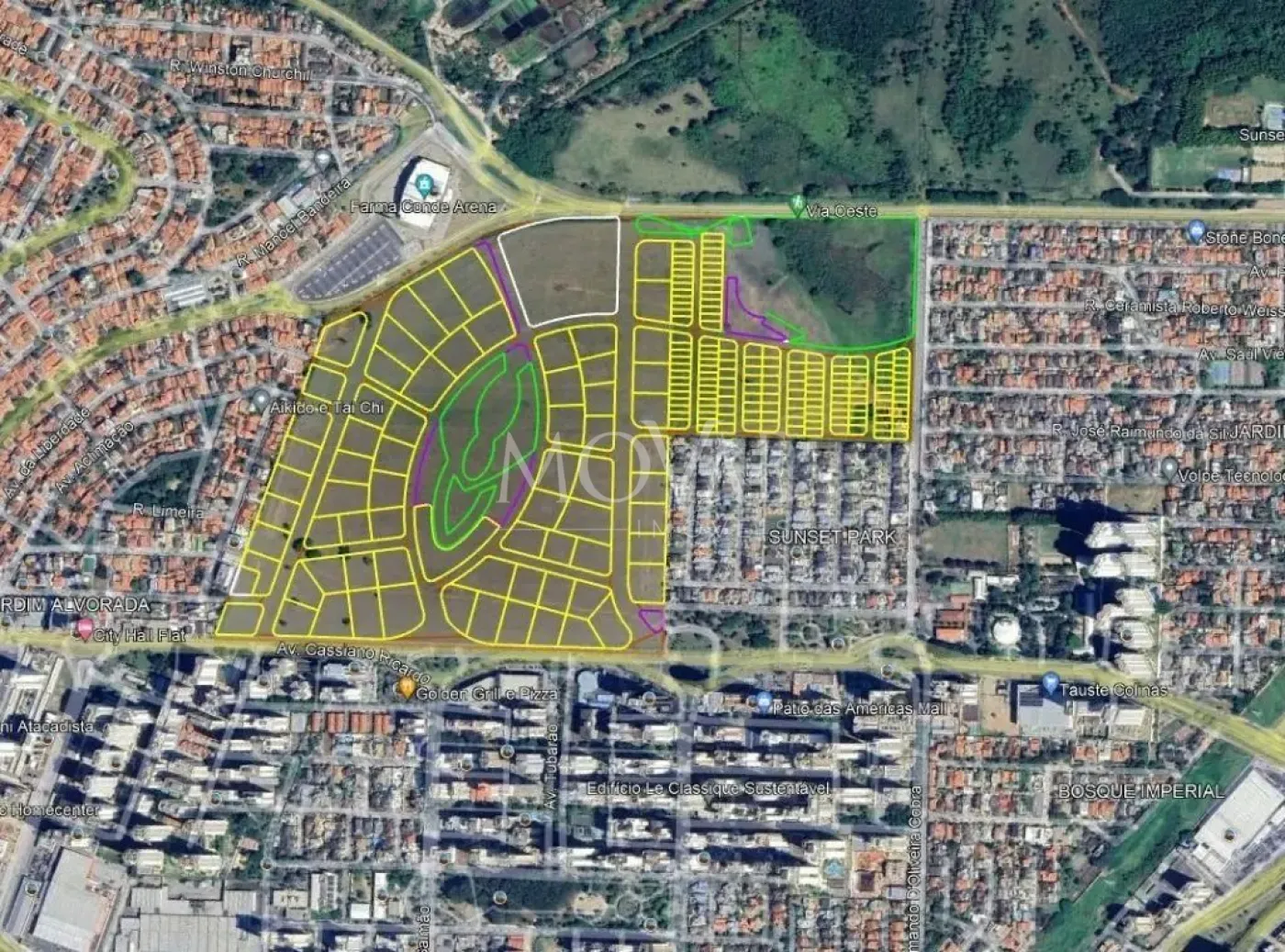 Conhecido como o terreno das vaquinhas, este empreendimento impressiona não só pelo seu tamanho, mas pela inovação: são 560.000m² de área que trazem uma nova forma de viver e conviver, com 143 lotes cuidadosamente distribuídos, incluindo: